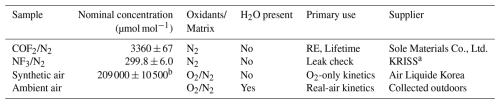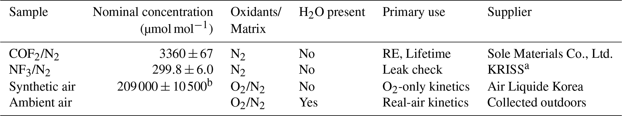 Three certified gas mixtures, along with humid ambient air used to simulate realistic atmospheric conditions, are summarized in Table 1. Three certified gas mixtures, each contained in high-pressure cylinders, were used for the experiments. Humid ambient air drawn from outside the laboratory was introduced when required to simulate realistic atmospheric conditions. The first cylinder contained COF2 diluted in nitrogen (COF2/N2, 3.360×103 µmol mol−1; Sole Materials Co., Ltd., Republic of Korea), which served as the primary sample for infrared measurements and enabled kinetic monitoring of COF2 decay for atmospheric lifetime determination. The COF2 mixture (3360±67 µmol mol−1, k=2) was prepared by diluting pure COF2 with high-purity N2, and its concentration was verified using the stoichiometric conversion reaction COF2+ O2→ CO2, calibrated against a certified CO2 reference gas (expanded uncertainty 2 %, k=2). The second cylinder held an NF3/N2 mixture (299.8±6.0 µmol mol−1, k=2), which was gravimetrically prepared and certified by the Korea Research Institute of Standards and Science (KRISS). Since NF3 is chemically stable under the experimental conditions, any observed changes in its spectral signature indicated physical leakage rather than chemical reaction. The third cylinder supplied rigorously dehydrated synthetic air (20.9±1.05 % O2 in N2, k=2; Air Liquide Korea Co., Ltd., Republic of Korea), which provided a moisture-free oxidizing matrix for isolating the O2-initiated degradation pathway of COF2. Humid ambient air was introduced at atmospheric pressure through a carbon-fiber inlet line fitted with a 2 µm mesh filter, providing a realistic atmospheric matrix containing both O2 and variable water vapor (approximately 41 %–45 % relative humidity (RH) at 25 °C). This carefully controlled gas environment enabled clear identification of the primary COF2 degradation pathways, driven by reactions with oxygen and water vapor, and provided a basis for estimating its atmospheric lifetime under conditions representative of the real atmosphere.