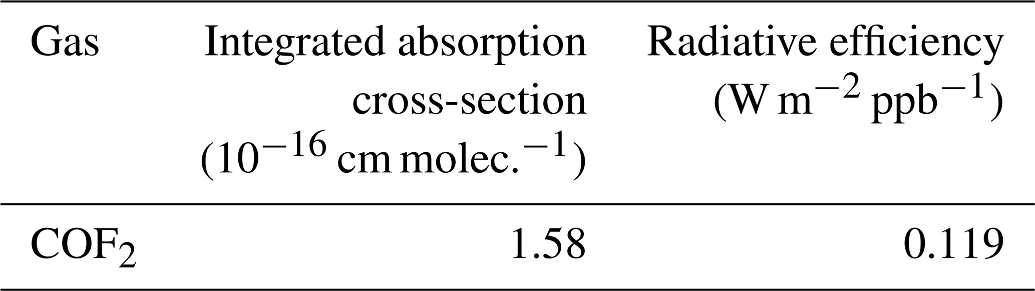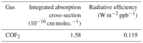 In this study, the GWP100 of COF2 was evaluated using the absolute GWP (AGWP) formulation adopted in recent climate assessments (Hodnebrog et al., 2013; Myhre et al., 2013; Hodnebrog et al., 2020). GWP is defined as the ratio of the time-integrated radiative forcing from a 1 kg pulse emission of gas i at time t=0 to that from an equivalent 1 kg emission of CO2 over a chosen time horizon H: