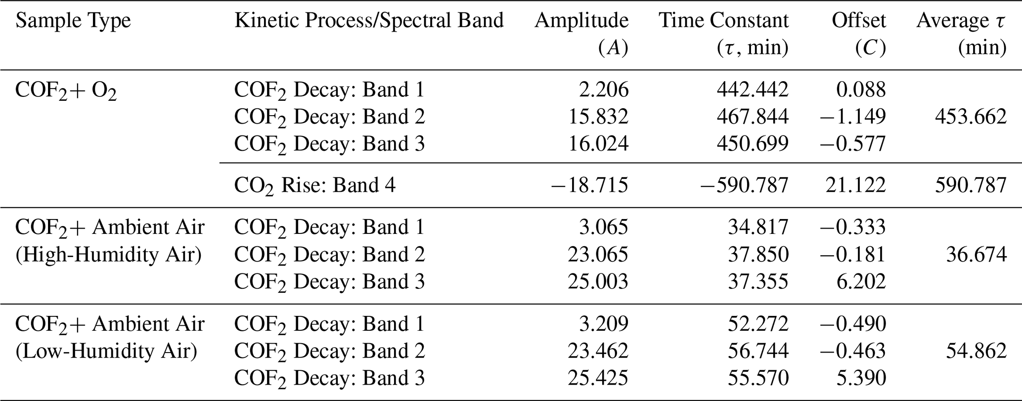 Table 3Exponential fitting parameters for the decay of COF2 or increase of CO2 under various atmospheric conditions. Each entry corresponds to a specific vibrational band, with parameters obtained from fitting the time-resolved data to the function . COF2–Ambient Air (Morning)” and “COF2–Ambient Air (Afternoon)” indicate experiments conducted during different times of the day to reflect ambient variation. The time constant (τ) represents the characteristic time of the exponential process, and the average τ was calculated across all bands within each sample type.