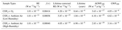 Table 4Radiative efficiency (RE), lifetime-corrected RE, experimentally determined atmospheric lifetimes, AGWP100, and resulting GWP100 values for COF2 under different reaction conditions. The lifetime correction factor f(τ) was applied to RE following Hodnebrog et al. (2013, 2020) (Eq. 5). Corrected RE values were integrated over a 100-year horizon to obtain AGWP100, which was then normalized by the reference AGWP100 for CO2 ( W m−2 yr kg−1) to compute GWP100 (Eq. 1). COF2 decay was examined under three atmospheric conditions: a dry O2 environment (Relative Humidity (RH) <0.007 %, 23.9 °C), and two ambient-air conditions representing high humidity (44.3 % RH, 10.6 g m−3, 25.7 °C) and low humidity (41.8 % RH, 9.6 g m−3, 24.9 °C). These controlled humidity levels enabled assessment of moisture-driven COF2 removal.