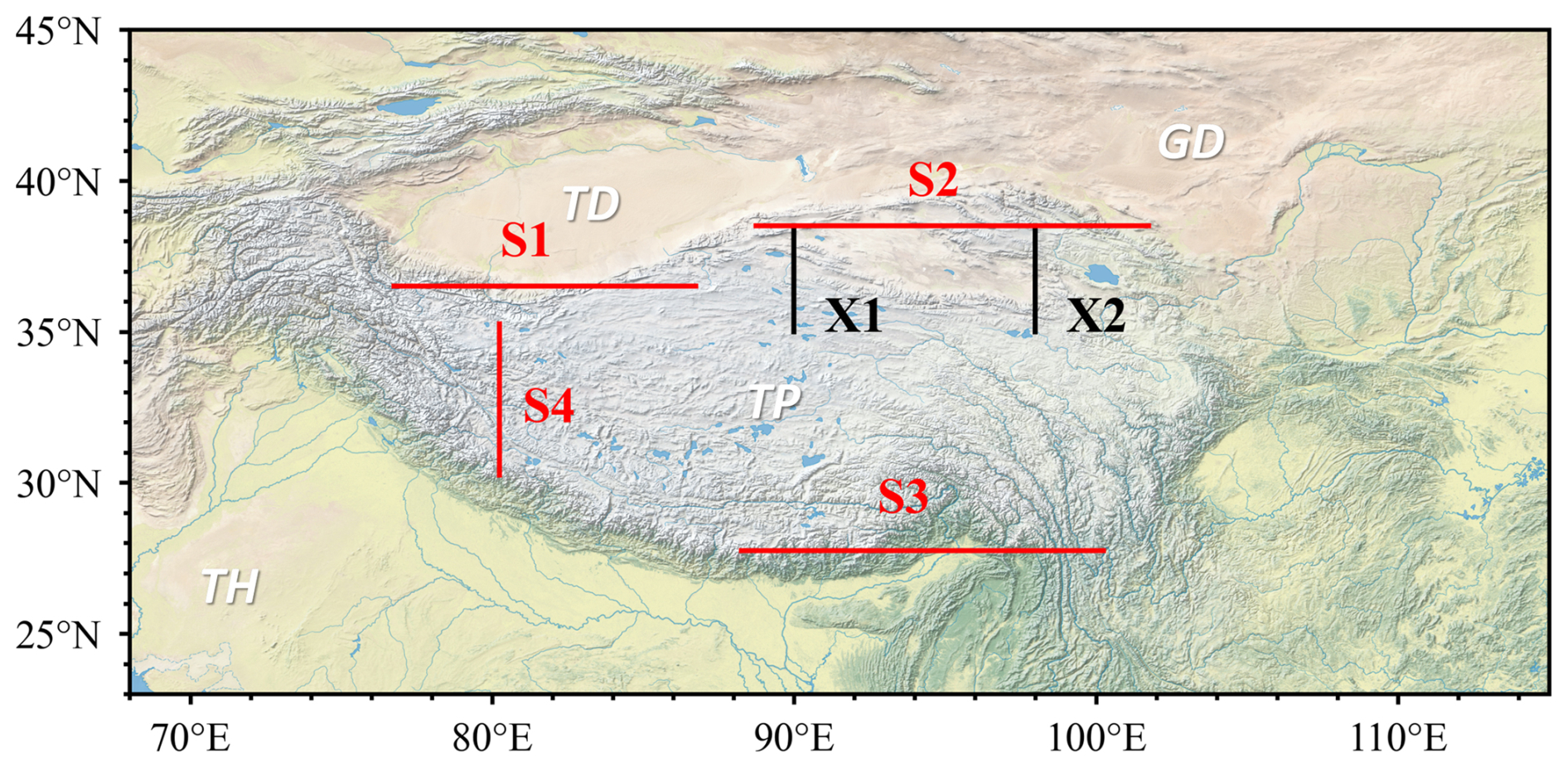 Figure 1The topography of the study aera (23–45° N, 68-115° E). S1 to S4 (S1: 36.5° N, 76.75–86.75° E; S2: 38.5° N, 88.75–101.75° E; S3: 27.75° N, 88.25–100.25° E; S4: 30.25–35.25° N, 80.25° E) were the selected boundaries for the TP-ward dust flux calculation and X1 to X2 (X1: 35–38.5° N, 90° E; X2: 35–38.5° N, 98° E) were used to quantify the dust contribution of the Qaidam Basin to downstream regions.TD, TP, TH, GD are Taklimakan Desert, Tibetan Plateau, Thar Desert and Gobi Desert. Base map data sourced from the Natural Earth dataset.