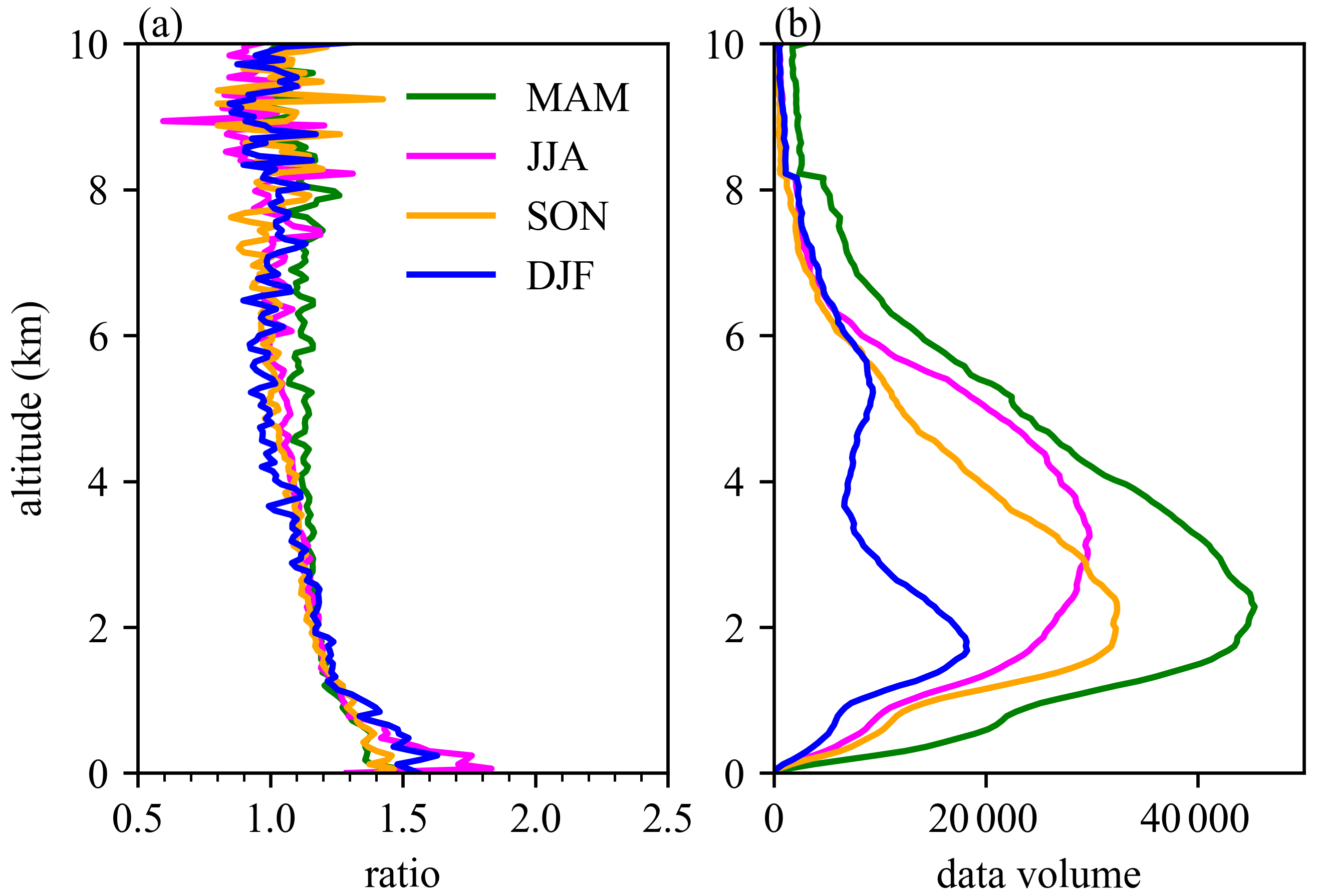 The CALIOP located on the CALIPSO satellite was widely used to study the distribution and transportation of aerosols since its launch in 2006 (Winker et al., 2013). CALIPSO v4.51 L2 aerosol profile product offered the aerosol extinction coefficient at both 1064 and 532 nm. The dust was picked by constraining the Atmospheric Volume Description, which described different feature types and characteristic subtypes. By extracting the CALIPSO σD profiles at two wavelengths on various altitudes in the study area from March 2016 to February 2017, the median profiles of the conversion ratio of extinction coefficient from 1064 to 532 nm (ratio = median of ) in different seasons were showed in Fig. 2. Based on the conversion ratio derived from the CALIOP products, the CATS σD profile at 532 nm was calculated from the CATS product at 1064 nm. Subsequently, these profiles were gridded to a horizontal resolution of 0.5° × 0.5° and a vertical resolution of 60 m.