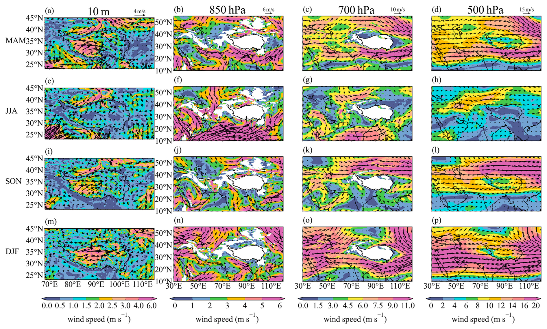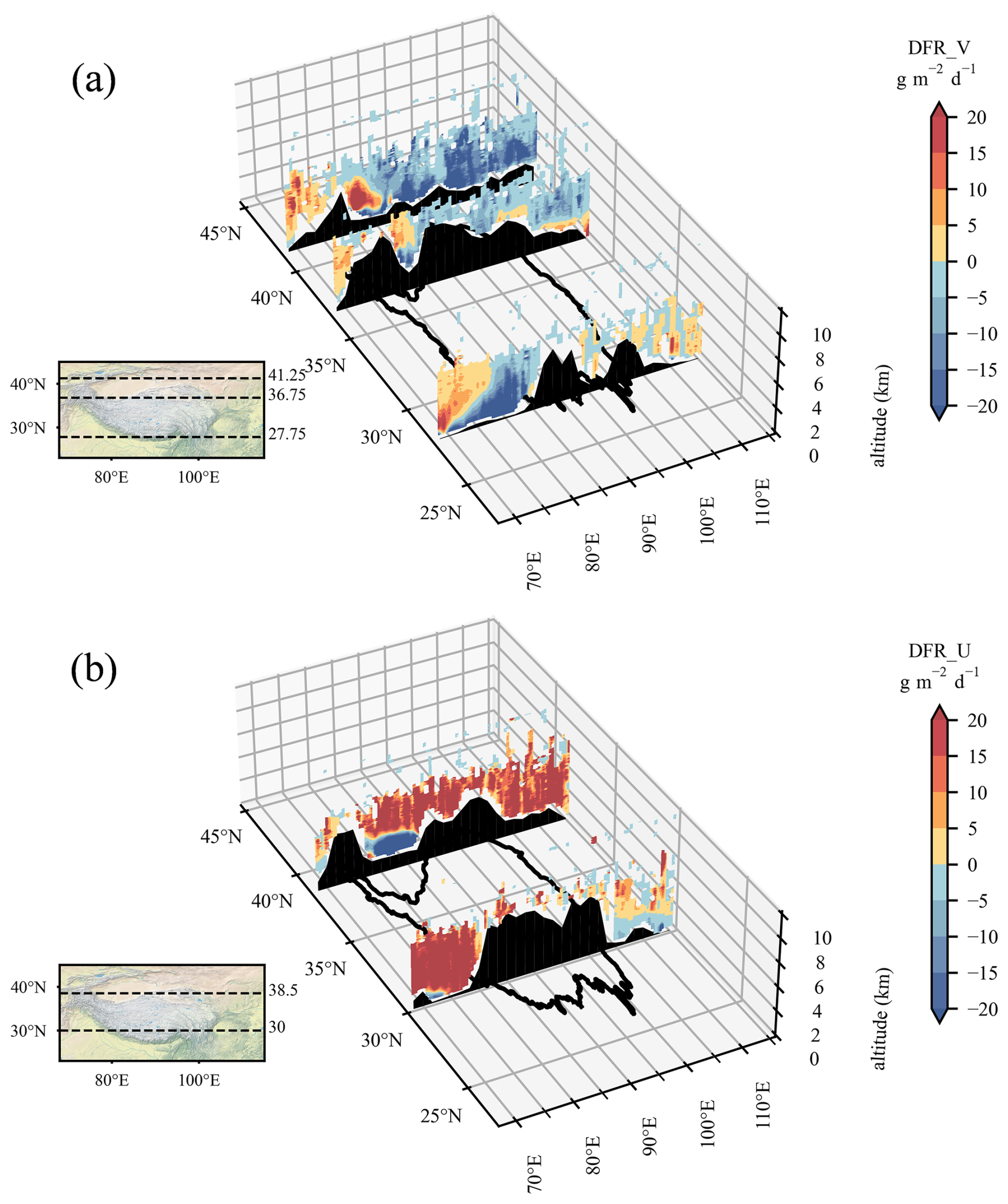 Based on the distributions of DFRC_U and DFRC_V (Fig. 6), the dust entering TP has multiple sources, such as TD, TH, Central Asia, and even Africa (Hu et al., 2020; Mao et al., 2019). Notably, it existed a dust backflow throughout the year in TD (Fig. 6b). The dust swept from the eastern entrance into the interior of TD, which was especially apparent in spring and summer. Due to the obstruction of the Pamir Plateau and the Tianshan Mountains, the cold air mainly invaded from the east side. During spring and summer, intense surface-atmosphere heat exchange leaded to the formation of a thermal low pressure in TD (Han et al., 2005). The combined effect of the cold air and thermal low pressure caused the strong easterly and northeasterly winds at the TD surface, and subsequently led to the dust backflow. Additionally, two pathways of transporting dust from TD to TP were clear according to Fig. 5i–l, q–t. The first path is of climbing the northern slopes of the Kunlun Mountains under the effect of rising air (Fig. 6a). The second path is of crossing the Qaidam Basin along with the northwesterly and northerly winds. In summer, the reduction of winds in 500 hPa and the northward shift of the westerly jet stream to the northern TP (Chen et al., 2017) diminished the eastward transport of the TD dust (Fig. 5f, n) while enhanced its southward transmission into the TP (Fig. 5j, r). Under the westerly and northerly winds, the GD dust was primarily transported eastward and southward to the downstream regions, and influenced less to the northeastern part of TP. TH is another significant dust source contributing to TP. The strong upward motion driven by the secondary circulation in this area provided essential dynamics for the vertical lifting of dust (Wang et al., 2021). Along with the increasing altitudes, the wind direction shifted from north to south, which facilitated the transport of floating dust to TP (Fig. 6). Additionally, a certain part of dust reaching TP was mainly from its eastern side of about 88° E. During summer, the southwest monsoon also provided significant assistance in lifting the dust and other aerosols onto the plateau (Liu et al., 2015).