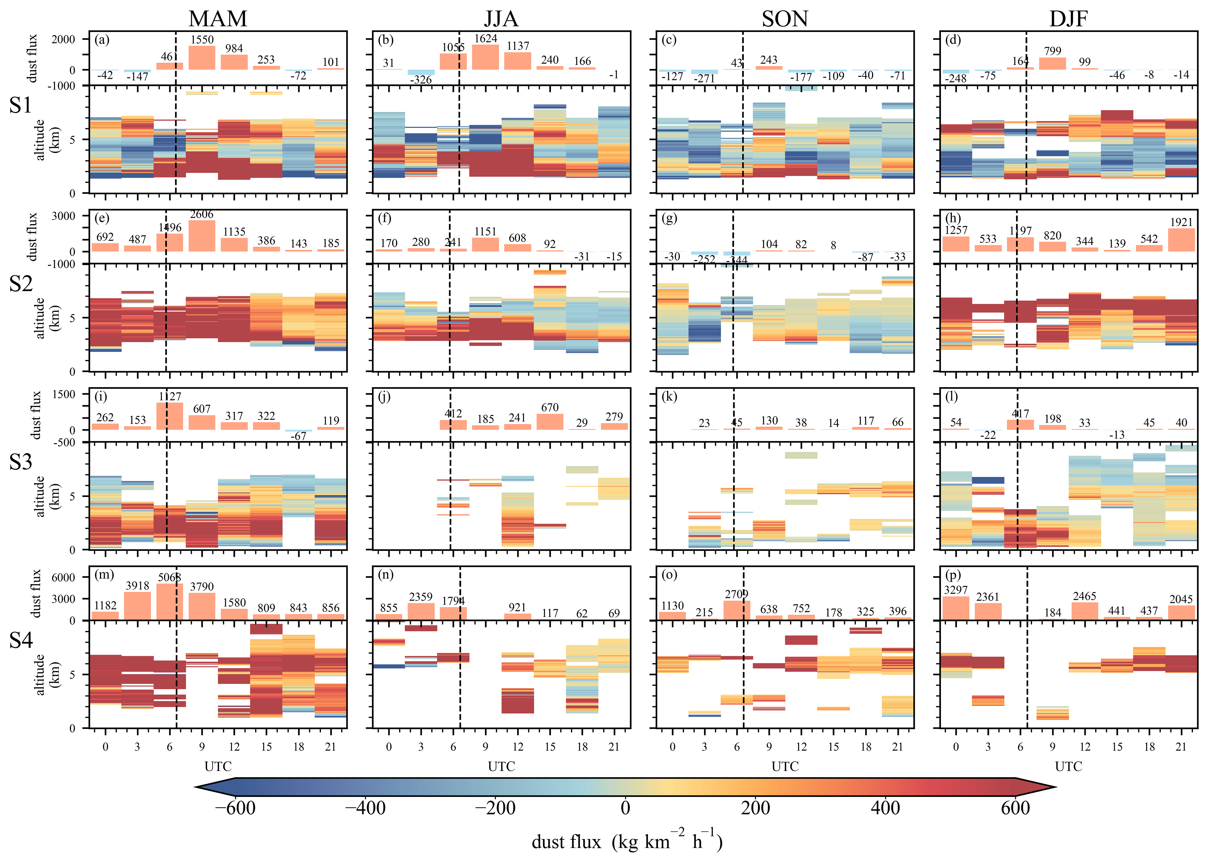Figure 9The three-hourly interval diurnal variations in the vertical distribution and column-averaged intensity of dust mass flux (kg km−2 hr−1) at cross-sections S1–S4 during dusty days during the period from March 2015 to October 2017 (the positive and negative values indicated the dust transport towards and away from TP, respectively. The dashed line denoted the 12:00 local time).