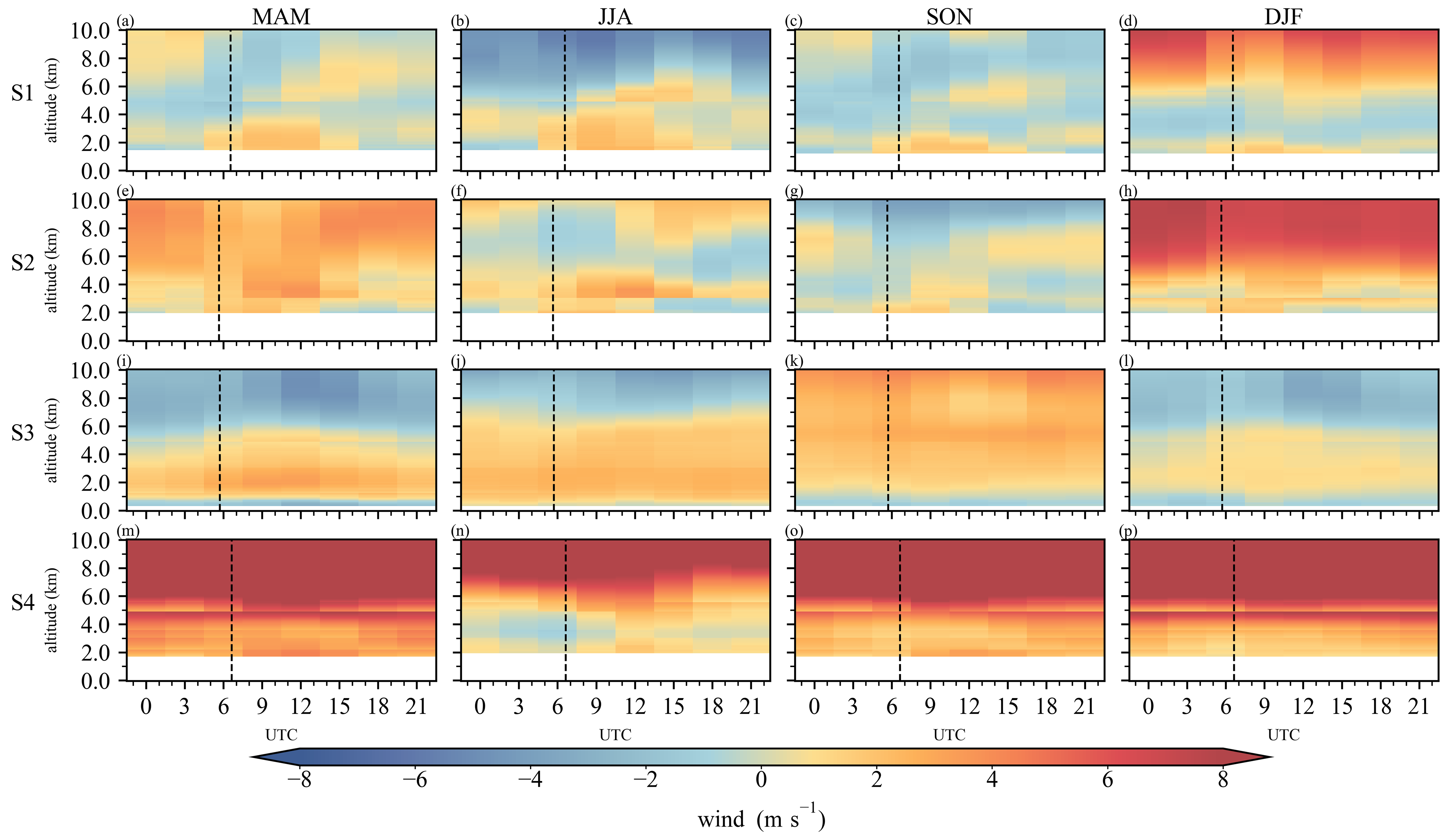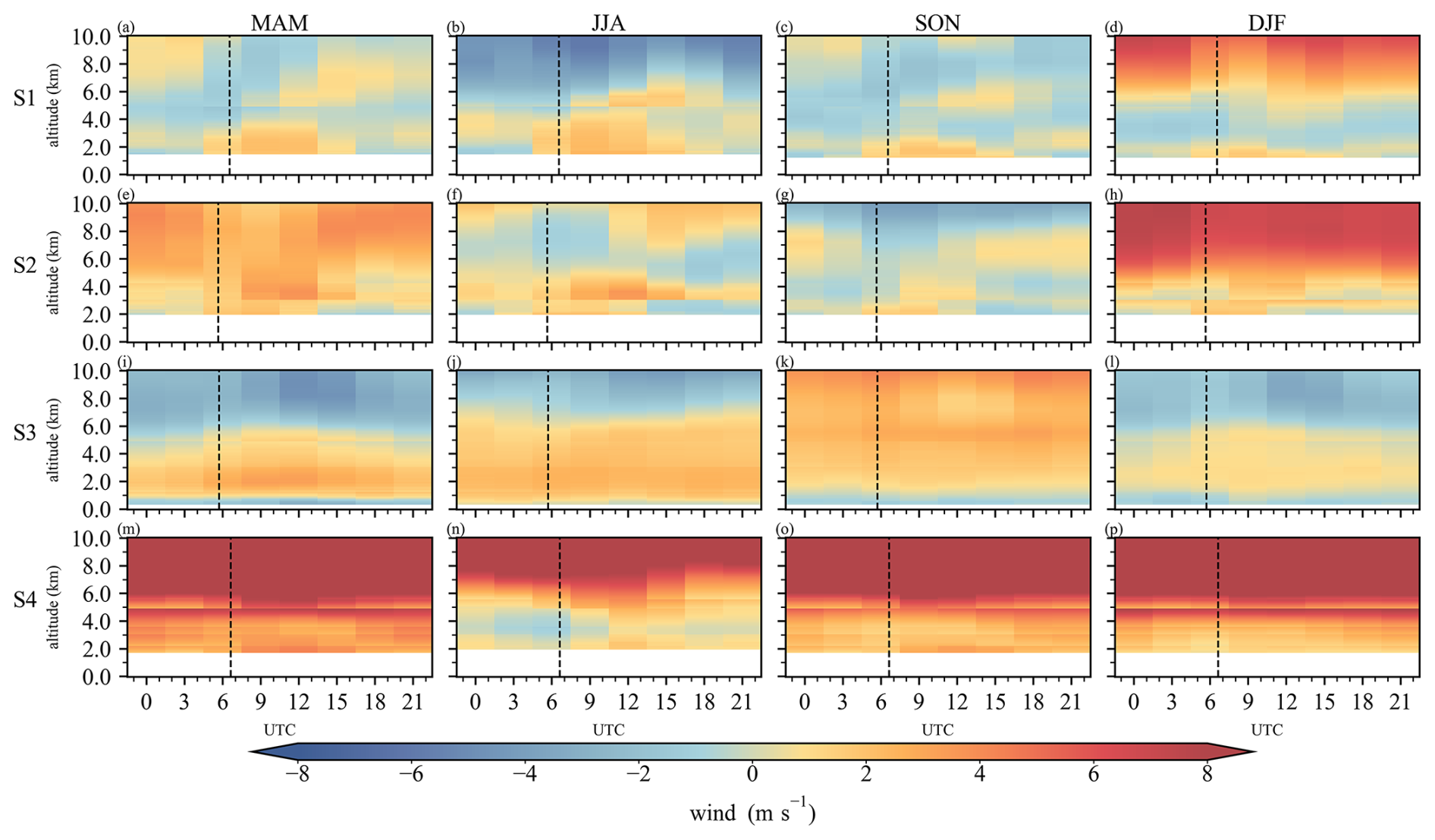 Figure 10The three-hourly interval diurnal variations of wind speed (m s−1) at cross-sections S1–S4 during dusty days during the period from March 2015 to October 2017 (3 h averages from hourly ERA5 data) (the positive and negative values indicated the wind flowing towards and away from TP, respectively. The dashed line denoted the 12:00 local time).