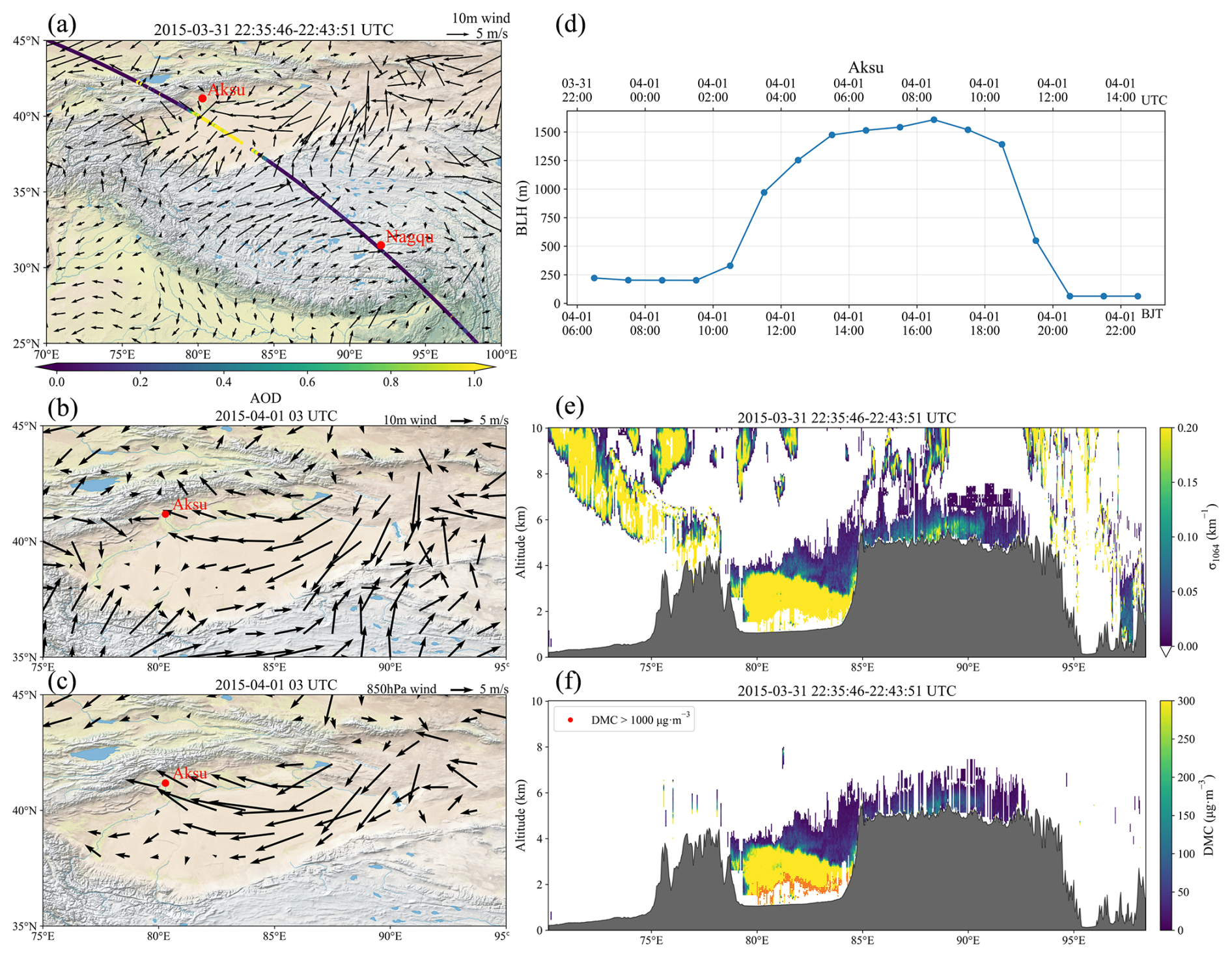 Figure 11Integrated analysis of a springtime dust event in 2015 based on CATS observations. (a) CATS overpass track and 10 m wind field at 22:00 UTC on 31 March (06:00 BJT on 1 April). Track colours indicated different aerosol optical depths (AODs). Red markers denote the locations of the ground-based environmental monitoring stations of Aksu (41.18° N, 80.29° E) and Nagqu (31.48° N, 92.06° E), respectively. (b, c) Wind fields at 10 m and 850 hPa at 03:00 UTC on 1 April (11:00 BJT on 1 April). (d) Hourly boundary-layer height (BLH) at Aksu. (e, f) Vertical profiles of total extinction coefficient at 1064 nm (σ1064) and DMC retrieved from CATS. Wind and BLH data are from the MERRA-2 reanalysis. The basemap is from the Natural Earth dataset.