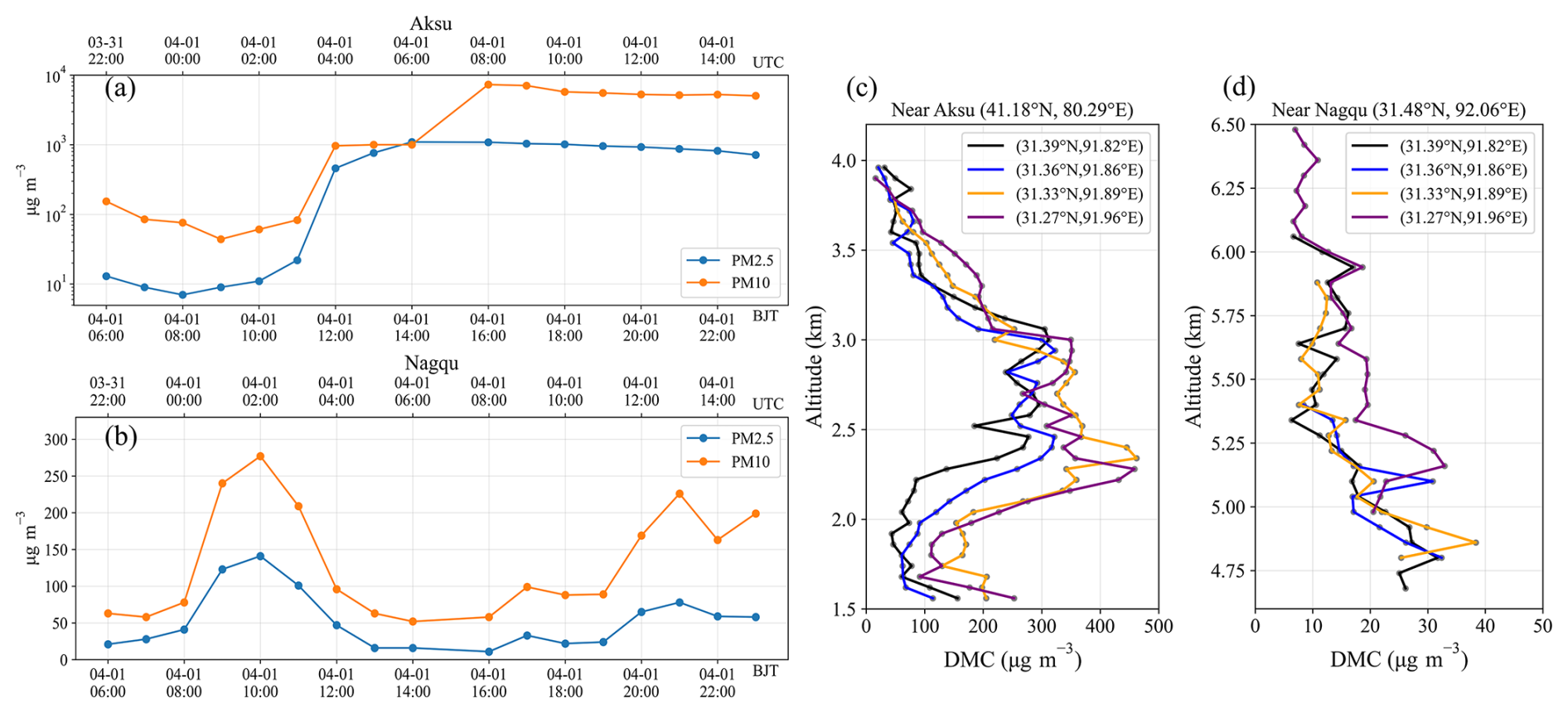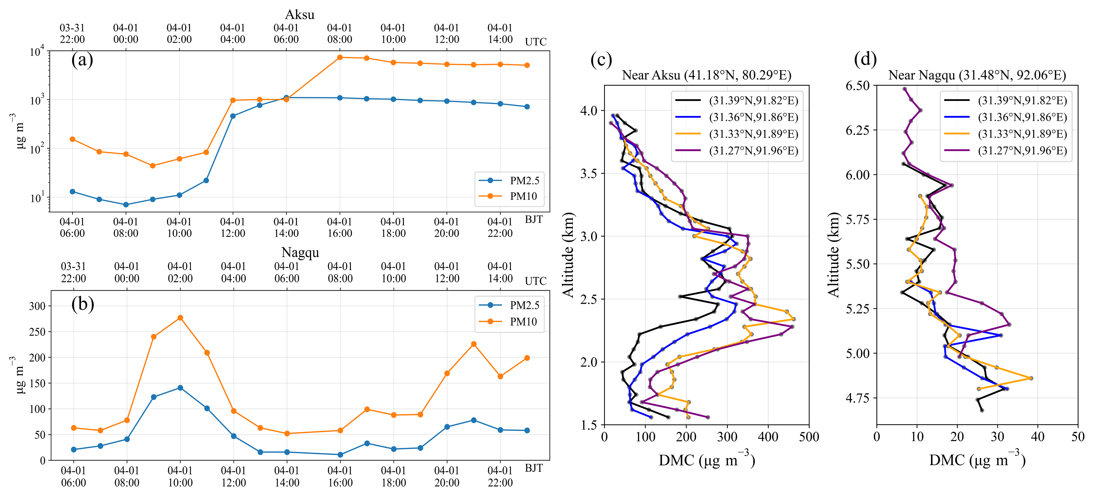 Figure 12(a, b) Temporal variations of PM10 and PM2.5 concentrations measured at Aksu (41.18° N, 80.29° E) and Nagqu (31.48° N, 92.06° E) ground-based environmental monitoring stations. (c, d) Vertical profiles of DMC retrieved from CATS along the ground track segments closest to Aksu and Nagqu during the 22:00 UTC overpass on 31 March 2015 (06:00 BJT on 1 April).