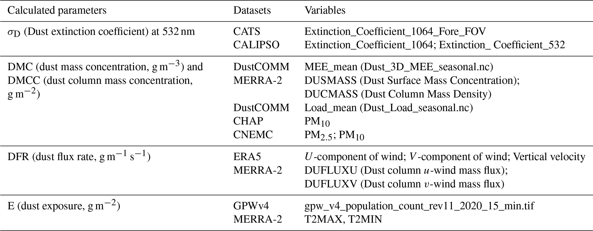 As shown in Fig. 1, the main study area included TP and three surrounding deserts: the TD, GD, and TH. Various meteorological and aerosol products, including ground-based, satellite-observed and reanalysis datasets, were used in this study. Details of calculated parameters, source datasets and corresponding variables were shown in Table 1.