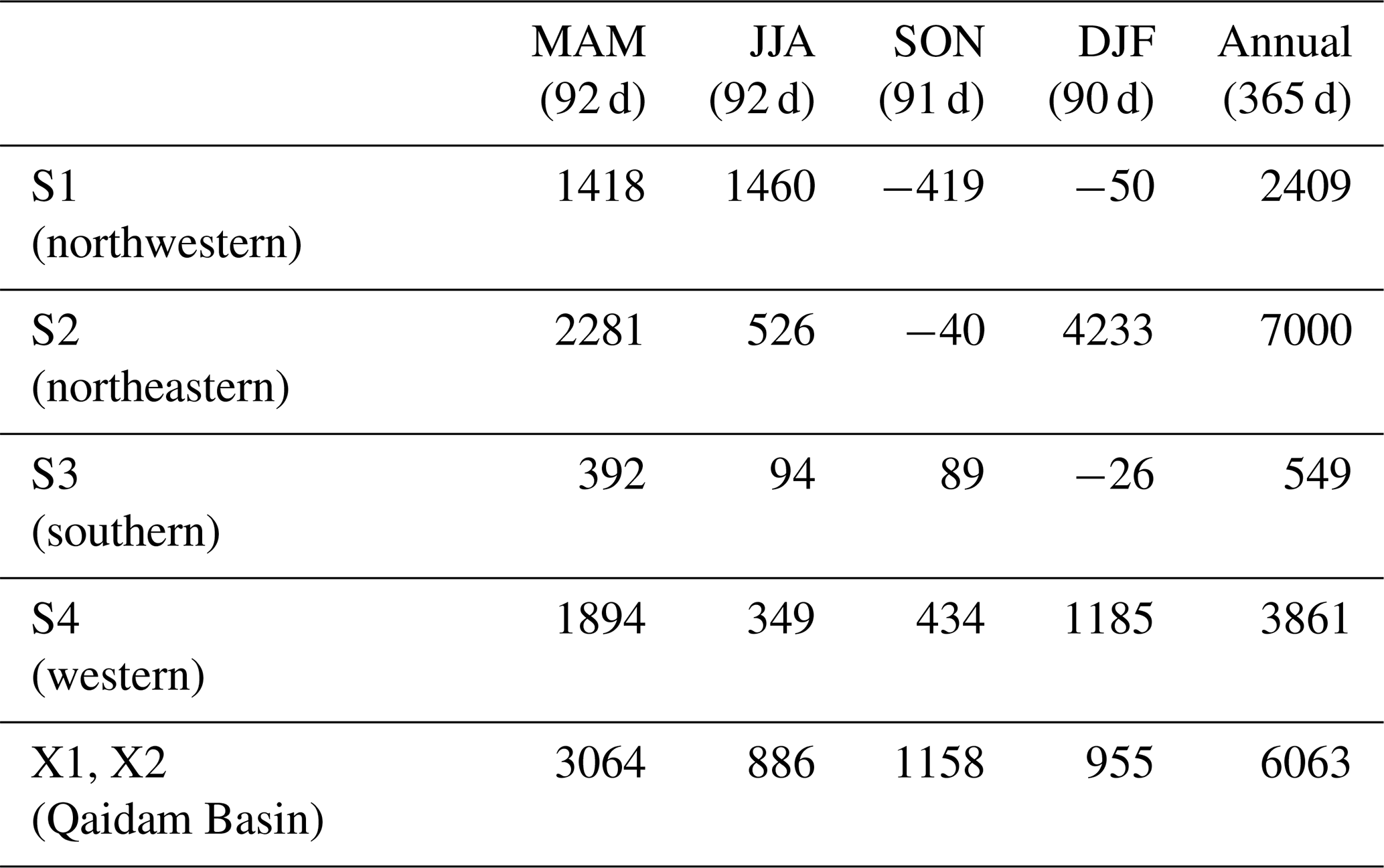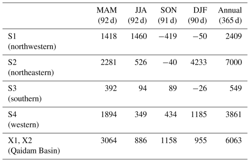 Table 2Seasonal and annual totals of column dust flux (unit: t km−1) toward the TP across the four sections of S1–S4 and the contribution of Qaidam Basin to the downstream regions due to westerly winds (the dust flux at sections of S1–S3 only considered the north-south direction, while at S4 only considered the east-west direction. X1 and X2 represented the western and eastern calculation boundaries for the Qaidam Basin, respectively. The geographic coordinates of the cross-sections are shown in Fig. 1. The negative values represented the exporting dust flux).