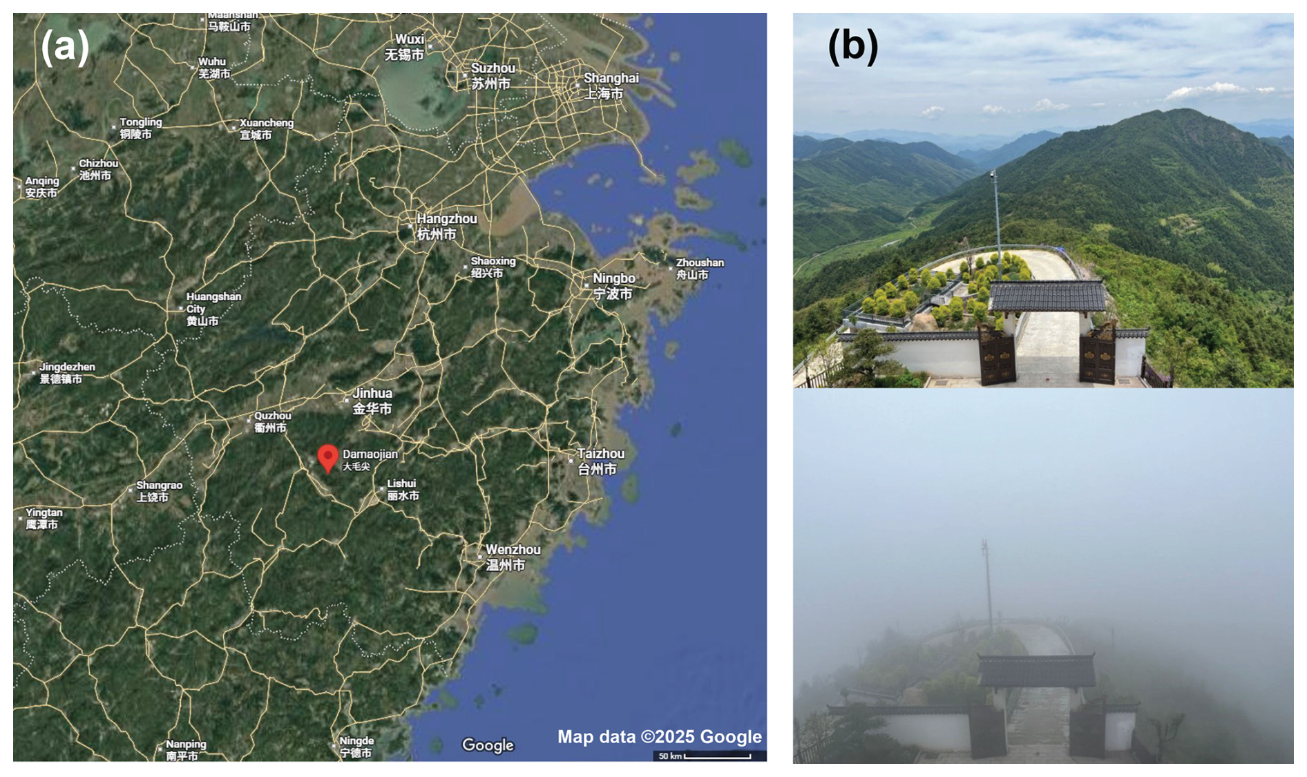 Figure 1Location of the Shanghuang site. (a) A map (from Google Maps) and (b) two photos of the sampling site, one with cloud and another without cloud.