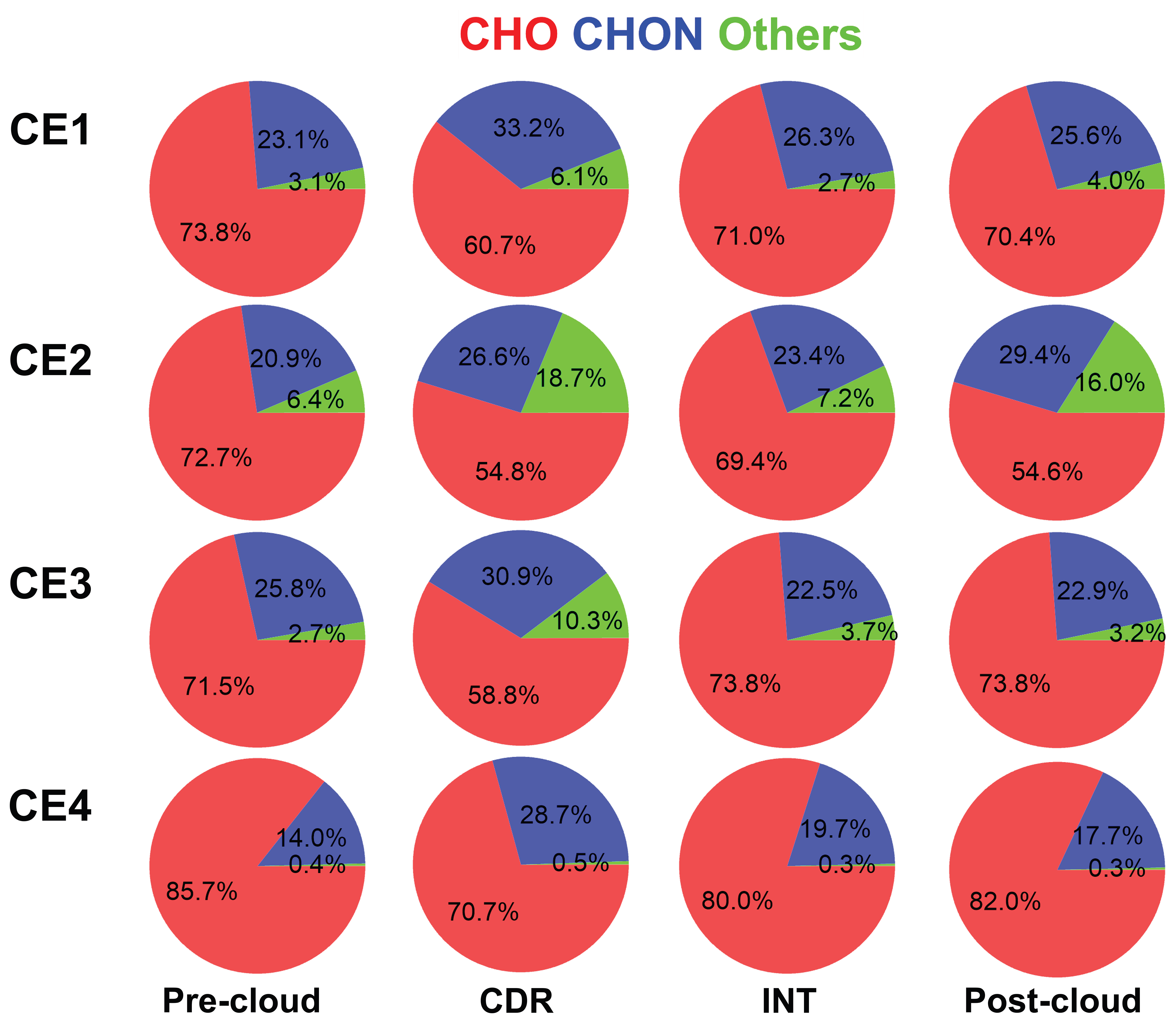 Figure 3Fractions of three classes of OA, namely CHO, CHON, and Others (including CHONS, CHOS, CHN, CHS, CHNS, and CHOSi) in pre-cloud aerosols, CDR, INT, and post-cloud aerosols in CE1, CE2, CE3, and CE4.