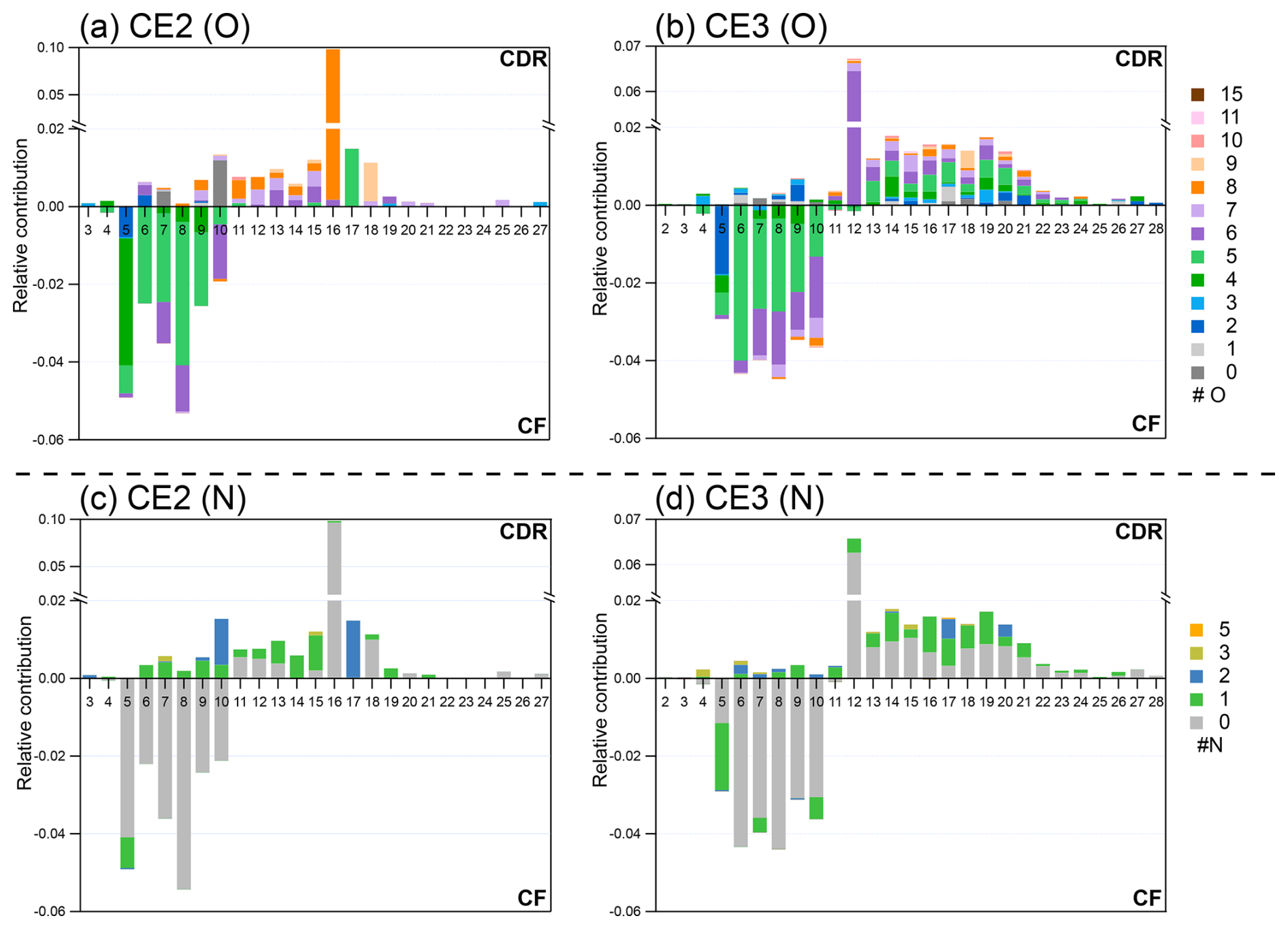 Figure 4Detailed relative contribution of OA. The average carbon number distribution of differences between CDR and CF are colored by oxygen number of (a) CE2, (b) CE3; and nitrogen number of (c) CE2, (d) CE3. Positive value stands for significant molecular characteristics of CDR, and negative value stands for that of CF. Fractions of compounds are normalized to sum of signals of all organics in CDR and CF, respectively.