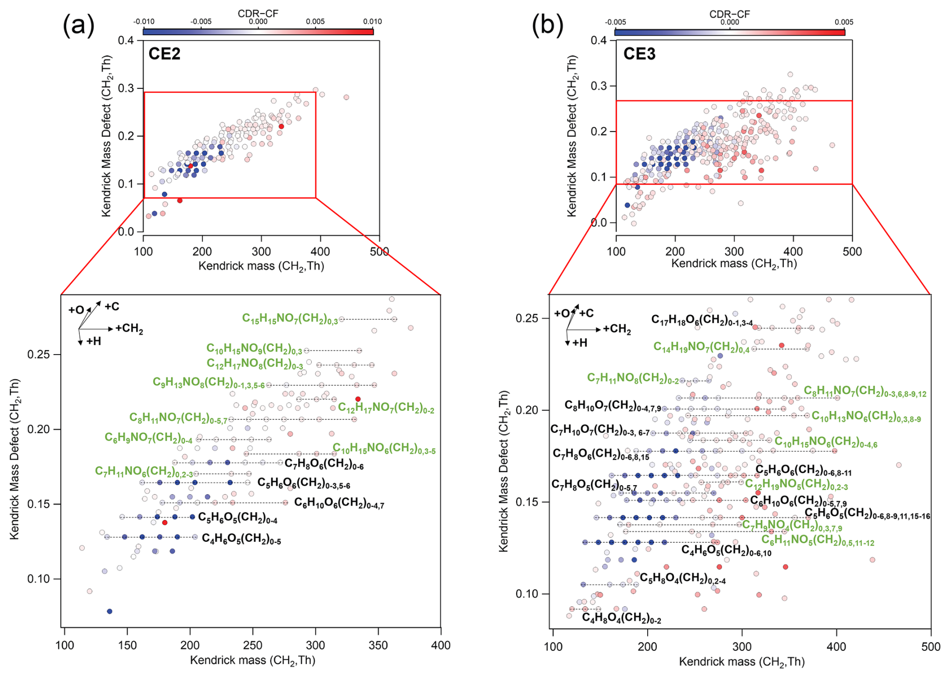 Figure 5Kendrick mass defect plots based on CH2 of compounds in (a) CE2 and (b) CE3. Data points are color-coded by differences in fractions of compounds between CDR and CF. Fractions of compounds are normalized to the sum of signals of all organics in CDR and CF, respectively. Note that, for conciseness, data points in CE3 with normalized signal difference between −0.0003 and 0.0003 (appearing nearly white) are not shown here. Siloxane compounds are not shown here for clarity.