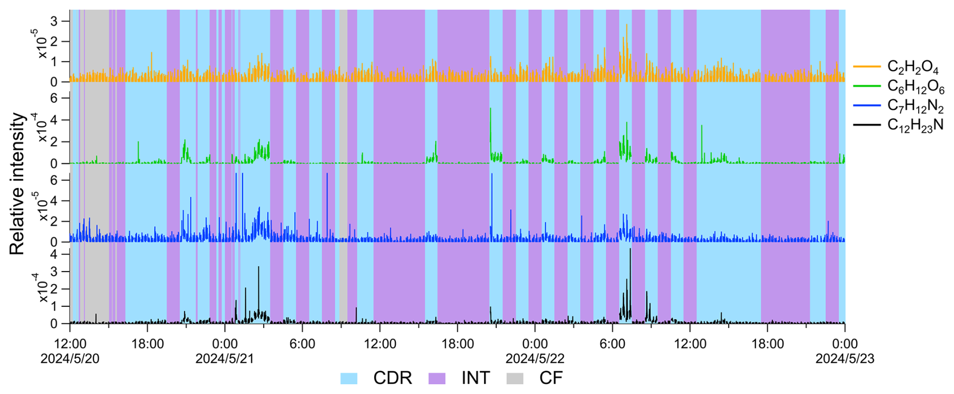 Figure 6Typical time series of compounds: carboxylic acid (C2H2O4), C6H12O6, N-containing substances including C7H12N2 and C12H23N, in a cloud episode. CDR, INT, and CF are shaded as blue, purple, and gray, respectively. Gaps in the time series represent EESI-ToF-MS background measurement periods, which are not shown.