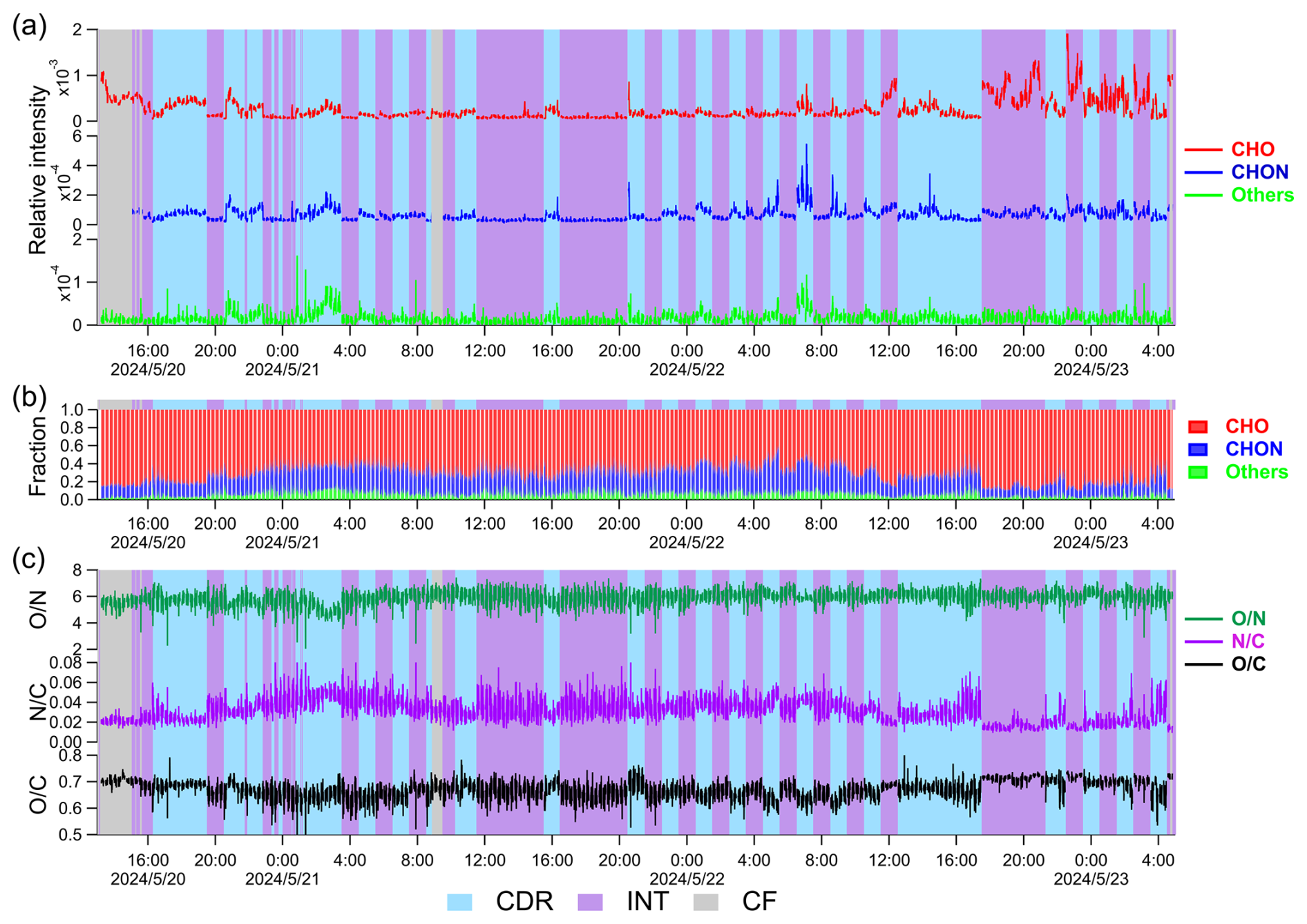 Figure 7Time series of three classes of organic compounds (CHO, CHON, and Others) in a long cloud. (a) Relative intensity, (b) fraction in OA, (c) O / N, N / C, and O / C ratio of OA. CDR, INT, and CF are shaded in blue, purple, and gray, respectively. Gaps in the time series represent EESI-ToF-MS background measurement periods, which are not shown.