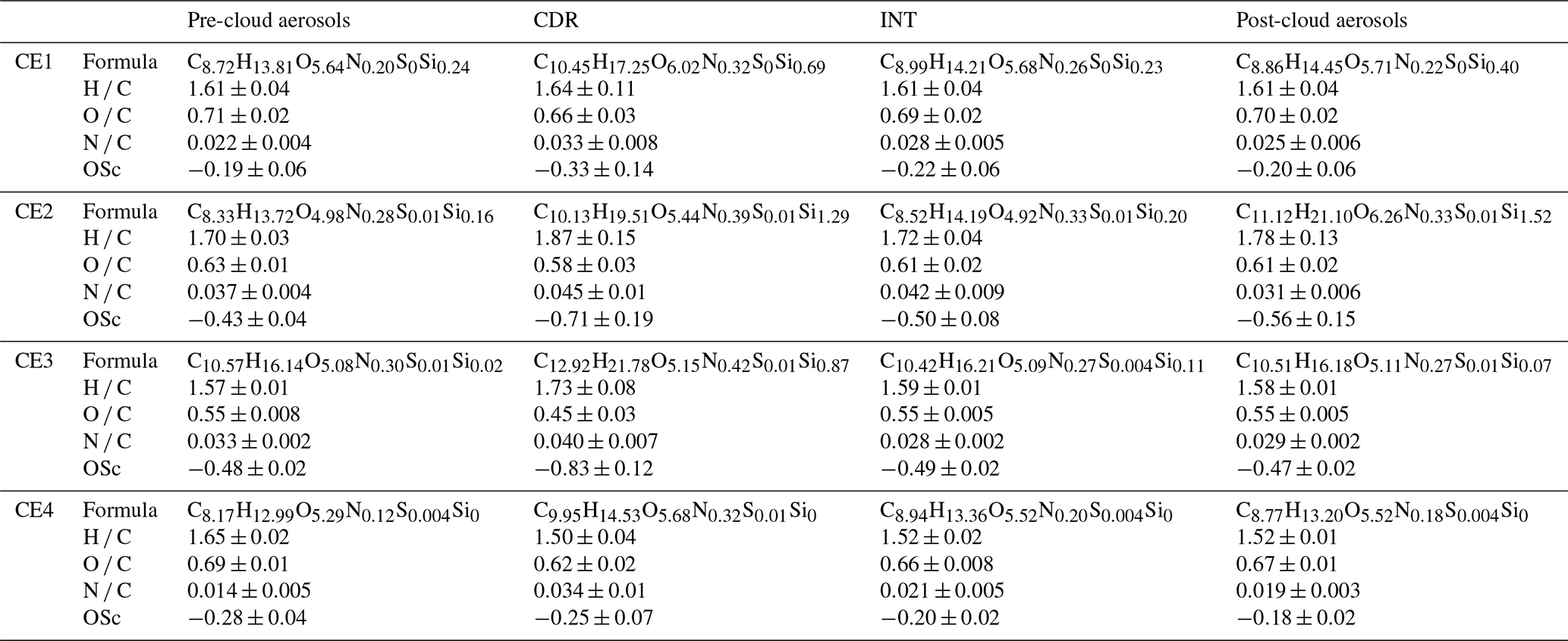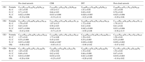 Table 1Mean molecular formulas and elemental parameters (H / C, O / C, N / C, and OSc; mean ± standard deviation) of OA for CE1–CE4 in pre-cloud aerosols, CDR, INT, and post-cloud aerosols.