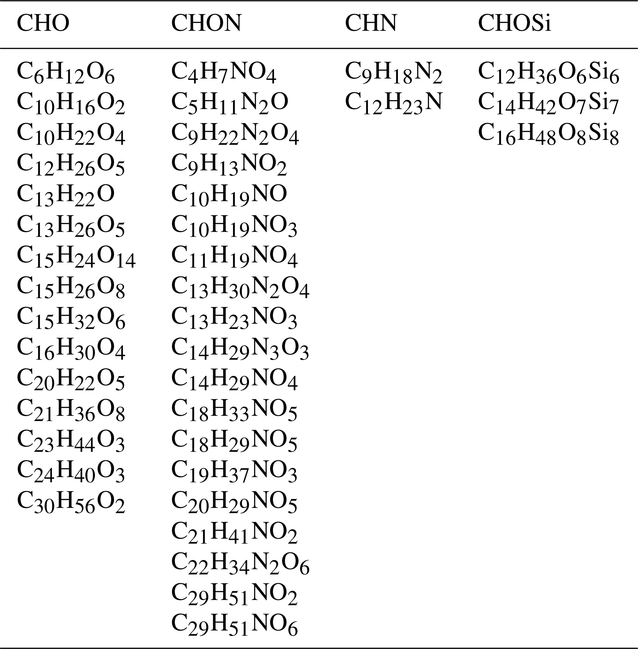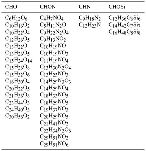 Table 2Thirty-nine enriched OA compounds observed in CDR of three or four CEs. These OA compounds are classified into four classes: CHO, CHON, CHN, and CHOSi.