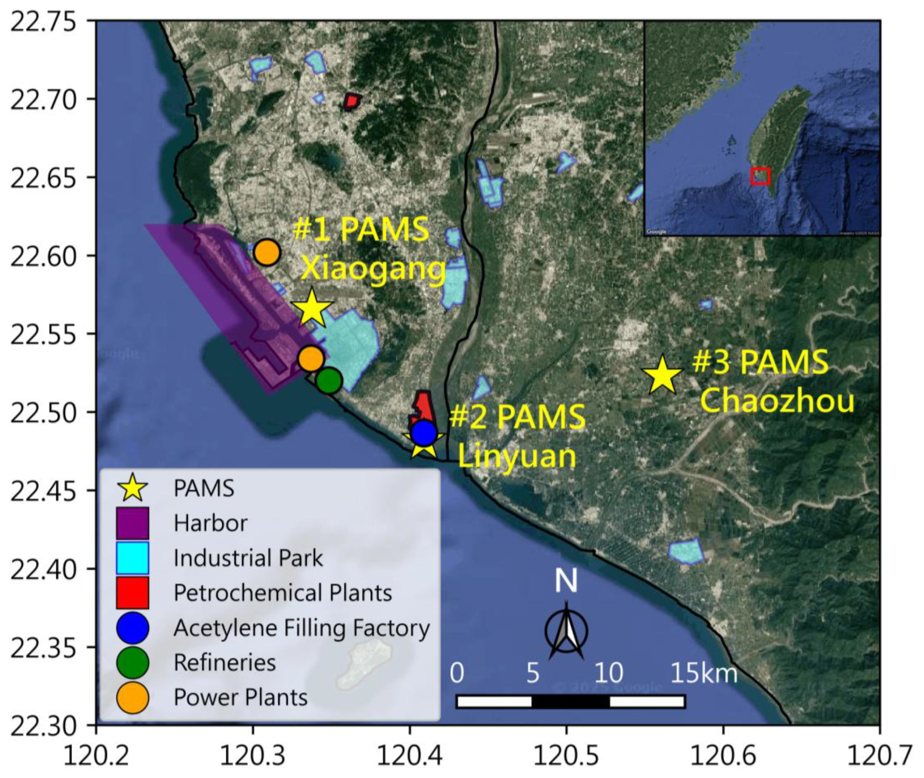 This study focuses on source apportionment of ambient NMHCs in the highly industrialized Kaoping region of southern Taiwan, approximately one-third the size of the New York metropolitan region, based on measurements from three PAMS monitoring sites: Xiaogang, Linyuan, and Chaozhou. The distinct locations of three sites and environmental settings provide a comprehensive view of source–receptor relationships across the region. Xiaogang, located in southern Kaohsiung, is a mixed urban-industrial area heavily influenced by emissions from multiple industrial activities. These include large petrochemical complexes, a regional airport, steel mills, metallurgical processing plants, shipyards, and power stations. In addition, maritime operations from Kaohsiung Harbor – one of the busiest ports in Asia – contribute significantly to local NMHC levels. Linyuan, situated along the southwestern coast and downwind of Kaohsiung's industrial corridor, is situated next to a large petrochemical complex frequently receiving high-concentration plumes from nearby facilities under the influence of coastal meteorology. Chaozhou, by contrast, is more inland and characterized by agricultural and vegetative land use, with minimal influence from industrial and urban anthropogenic sources. However, due to its geographic position downwind of the Kaohsiung industrial corridor, Chaozhou is susceptible to the regional pollution transported from neighboring urban and industrialized areas. As such, it serves as a receptor site for background air quality conditions with intermittent influence from upwind anthropogenic emissions. Together, the three sites offer spatial and environmental contrasts that support robust source apportionment and allow for evaluation of both local emission characteristics and regional transport dynamics in the Kaoping region.