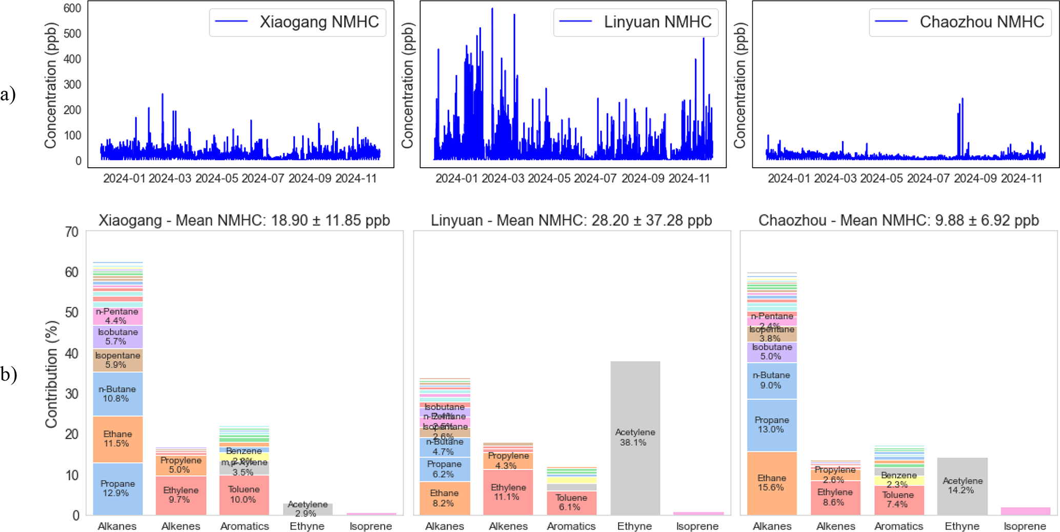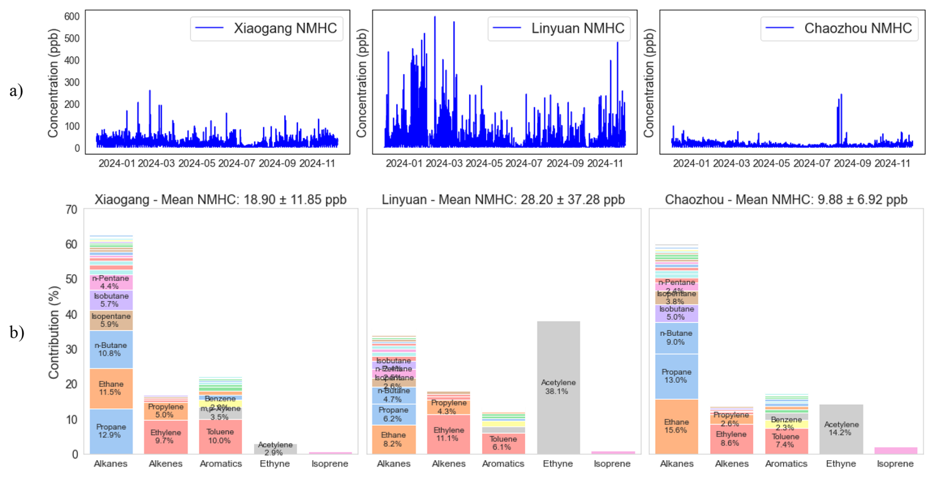 Figure 2Time series of total NMHC concentrations and mean composition of NMHC groups at Chaozhou, Linyuan, and Xiaogang in 2024. (a) Hourly variations illustrate temporal patterns and notable episodic peaks at each site. (b) Mean NMHC concentrations (ppb) and percentage contributions of individual compounds within major chemical groups. The mean concentrations of individual species are presented in Fig. S3.