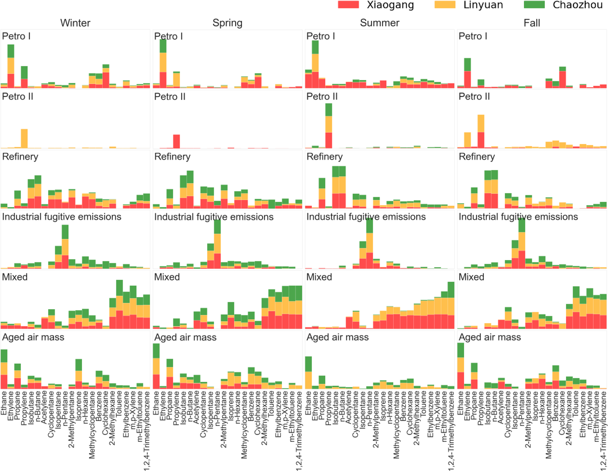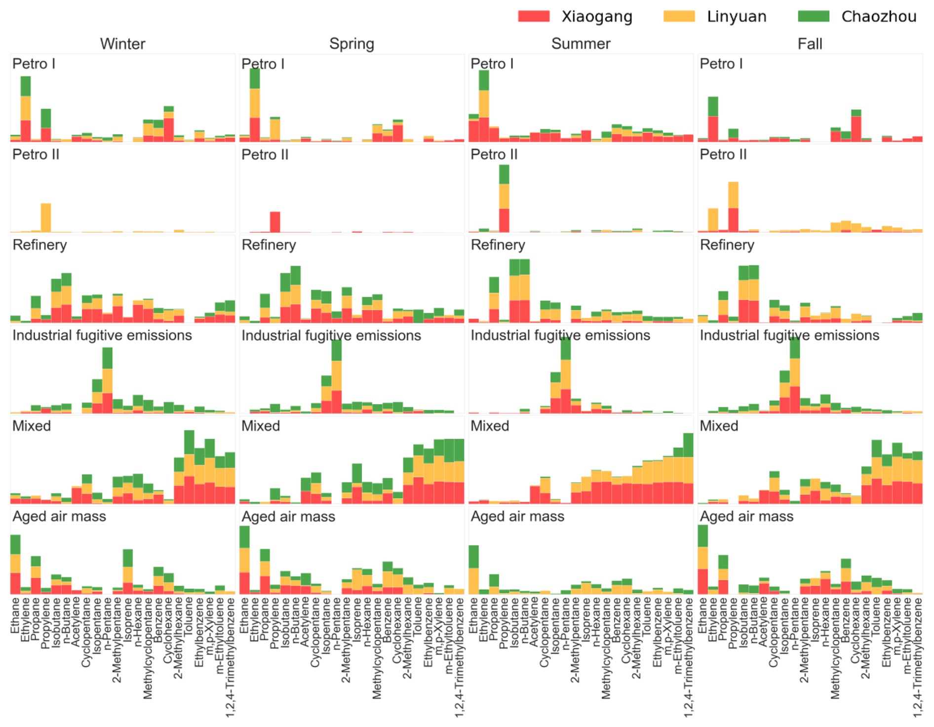 Figure 3Summary of common source profiles of NMHC at the three sites in 2024. This figure presents the percentage contribution of six common source factors (Petro I, Petro II, Refinery, Industrial fugitive emissions, Mixed, and Aged air mass) to the total NMHC burden at three monitoring sites: Xiaogang (red), Linyuan (orange), and Chaozhou (green) across four seasons (Winter, Spring, Summer, and Fall). Each panel represents a specific source factor and season combination. The stacked bars within each panel show the relative contribution of NMHC species to that source factor. Consistent source profiles of fingerprint species were observed across seasons and at all three monitoring sites, underscoring the robustness of the PMF results.