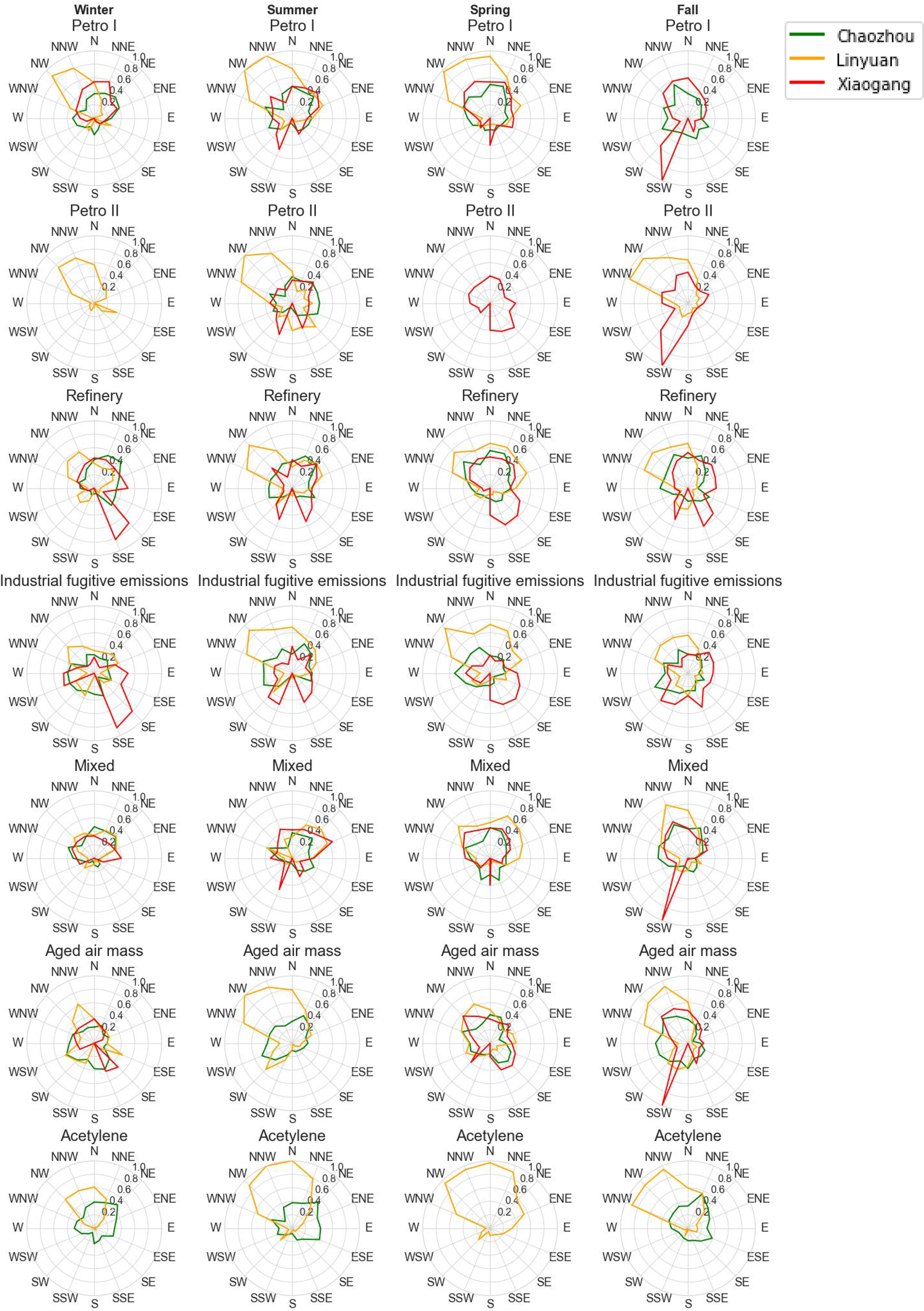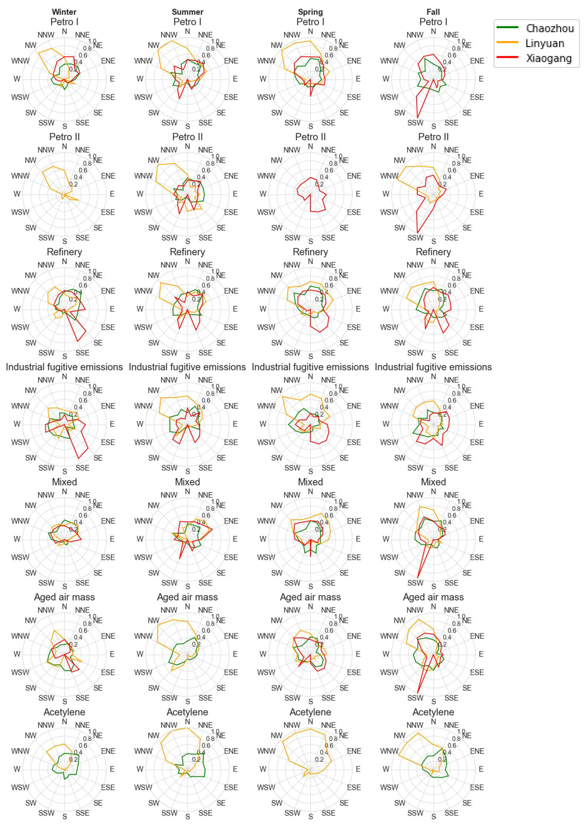 The PMF-resolved time series contribution for Petro I and Petro II reveals episodic spikes, with no clear pattern of increase or decrease during weekends (Fig. S5), suggesting these events may be associated with perennial petrochemical processes with constant fugitive emissions. Linyuan consistently exhibits the highest contributions for both Petro I and II during winter and, to a lesser extent, spring and fall, followed by a distinct decline in summer. In contrast, Xiaogang's Petro I contributions rise notably in fall and remain elevated into the winter with a lesser extent in spring, though Petro II activity there is less pronounced. Chaozhou records consistently low contributions for both factors throughout all seasons, indicating minimal influence from these industrial sources (Fig. S5, green line). Spatial analysis of the preferred source directions for Petro I and II further underscores site-specific differences. At Xiaogang, the dominant influence comes from northerly winds in fall, spring, and winter (Fig. 4, red line), while stronger southerly winds are observed in summer and peak in fall, emphasizing the role of prevailing winds in the Kaohsiung area. It highlights the complexity of source contributions and the importance of meteorological conditions in modulating observed concentrations. This pattern aligns with the spatial distribution of active petrochemical facilities in Kaohsiung City, as shown in Fig. 1, and is reflected in the dominant source directions in Fig. 4. For Linyuan, the prevailing source direction is from the northwest, consistent with the site location downwind of Linyuan industrial areas (Fig. 4, orange line).
