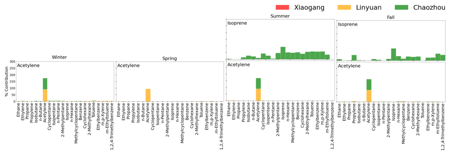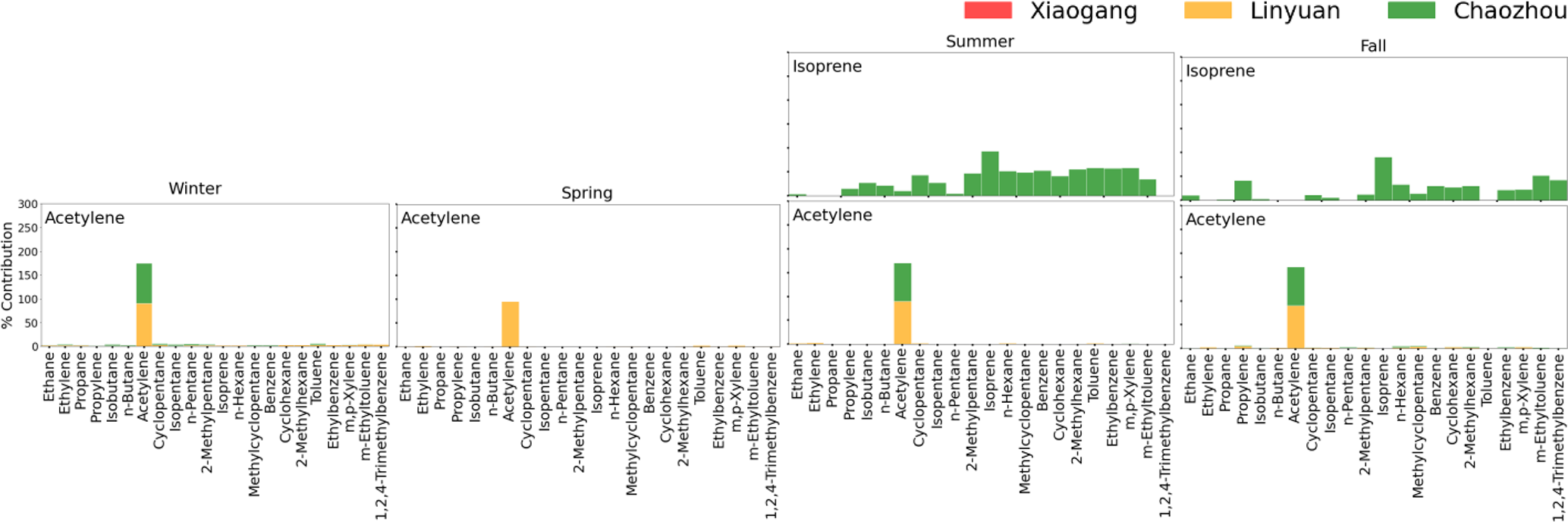 Chaozhou is an agricultural area that leads to open-field biomass burning beginning in late summer and extending to the rest of the year. Acetylene is an emission from incomplete combustion processes, such as biomass burning (Burling et al., 2010; Wang et al., 2014), and therefore exhibits its strongest summer spikes and weaker, intermittent fall and winter contributions (Figs. 2a and S1). This seasonal pattern reflects intermittent but intensified combustion activities rather than continuous emissions. Consequently, although PMF resolves an acetylene-rich factor at both Linyuan and Chaozhou, its contribution at Chaozhou is much lower (Fig. S5). Unlike Linyuan – where a known nearby acetylene filling plant provides a persistent local source – Chaozhou is influenced mainly by diffuse biomass burning and other small-scale, variable combustion activities. The absence of a strong directional signal in the CPF analysis for Chaozhou further supports the interpretation that acetylene in Chaozhou originates from non-point or variable sources rather than a single dominant emitter.