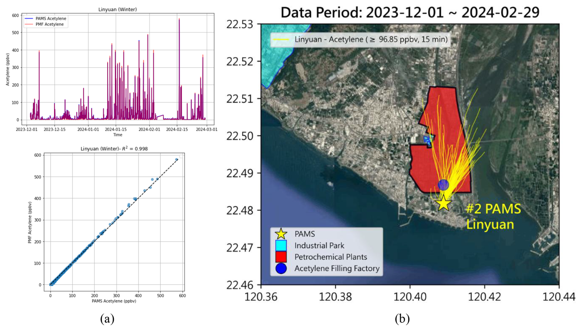 Figure 6The acetylene factor at Linyuan. (a) Agreement of PAMS and PMF-resolved factor. (b) Triggered back trajectory analysis of spike levels. Base map from Google Maps (Map data © 2025 Google).