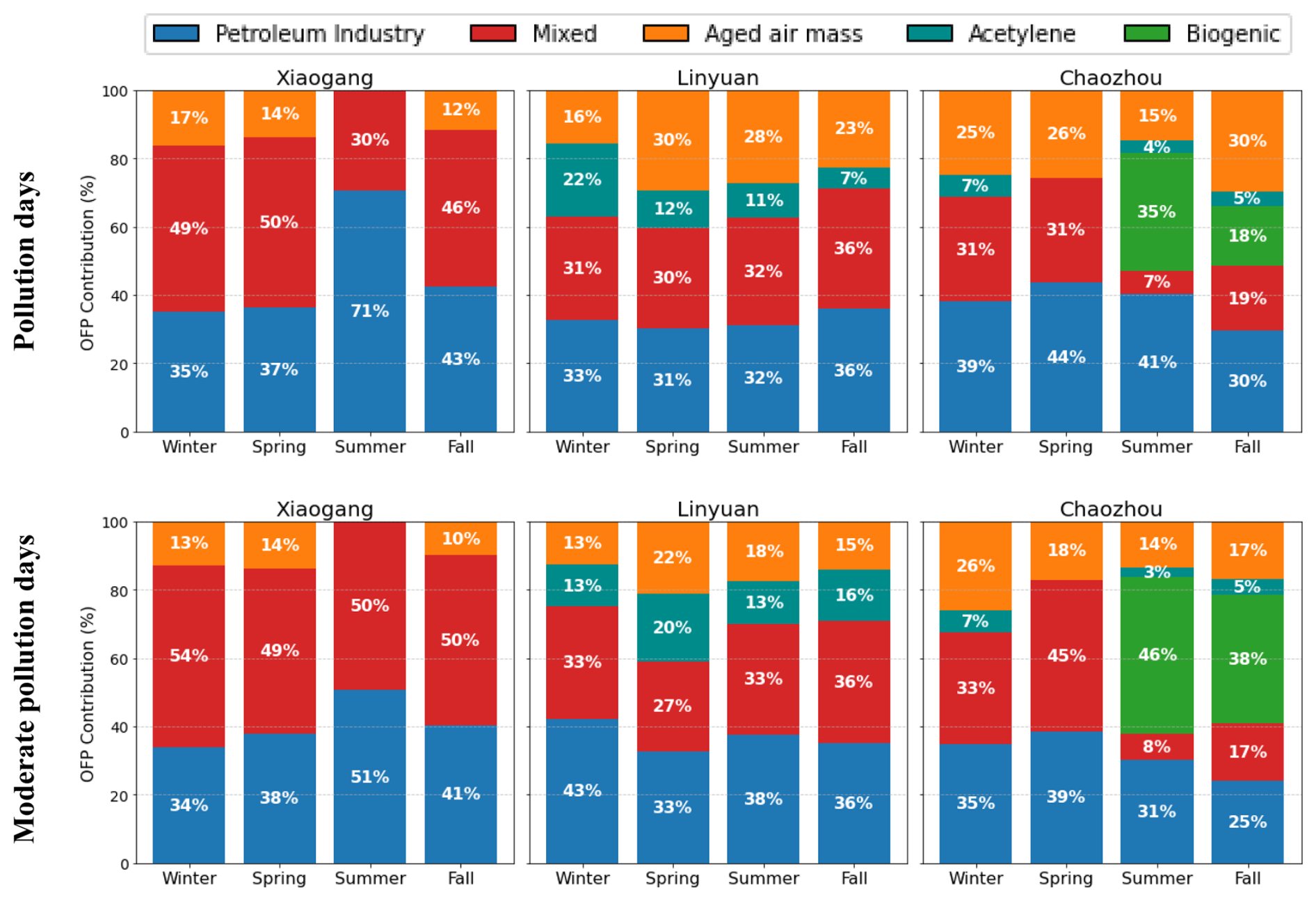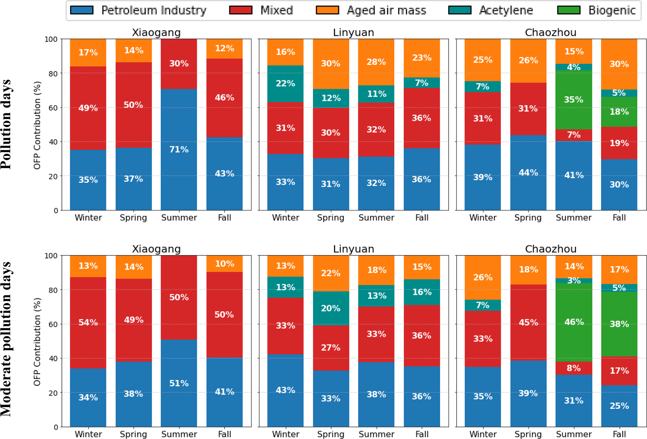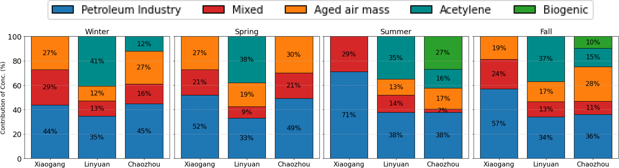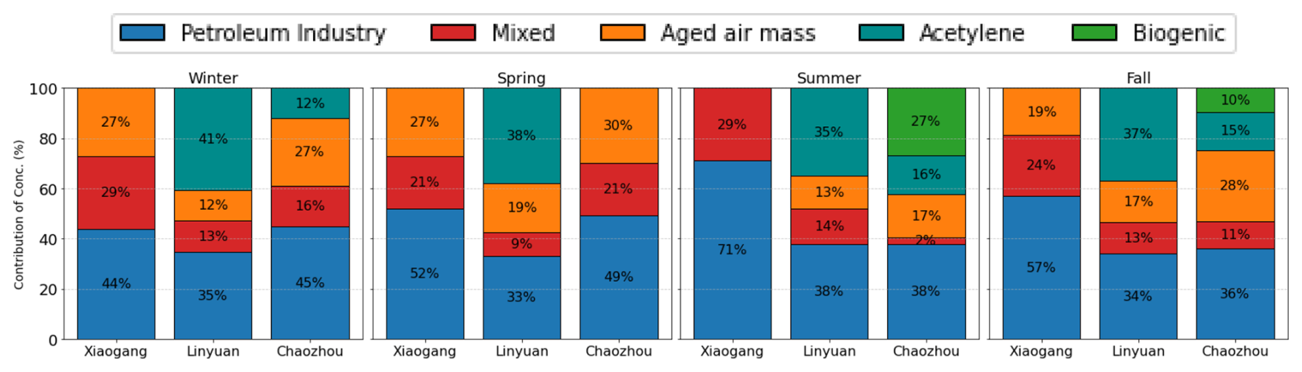 The differences in source contribution across the three sites are not arbitrary but rather reflect the distinct roles each monitoring station plays within the regional emission landscape. Linyuan functions as a source site because it is home to major refinery and petrochemical facilities. Xiaogang, by contrast, presents a mixed urban-industrial environment, while Chaozhou acts as a downwind receptor site in a predominantly rural setting. Since many NMHC species originate from multiple source types, the resolved factors were grouped into broader categories: petroleum industry (including petro I & II, refinery, and industrial fugitive emissions), mixed, aged air mass, acetylene, and biogenic.