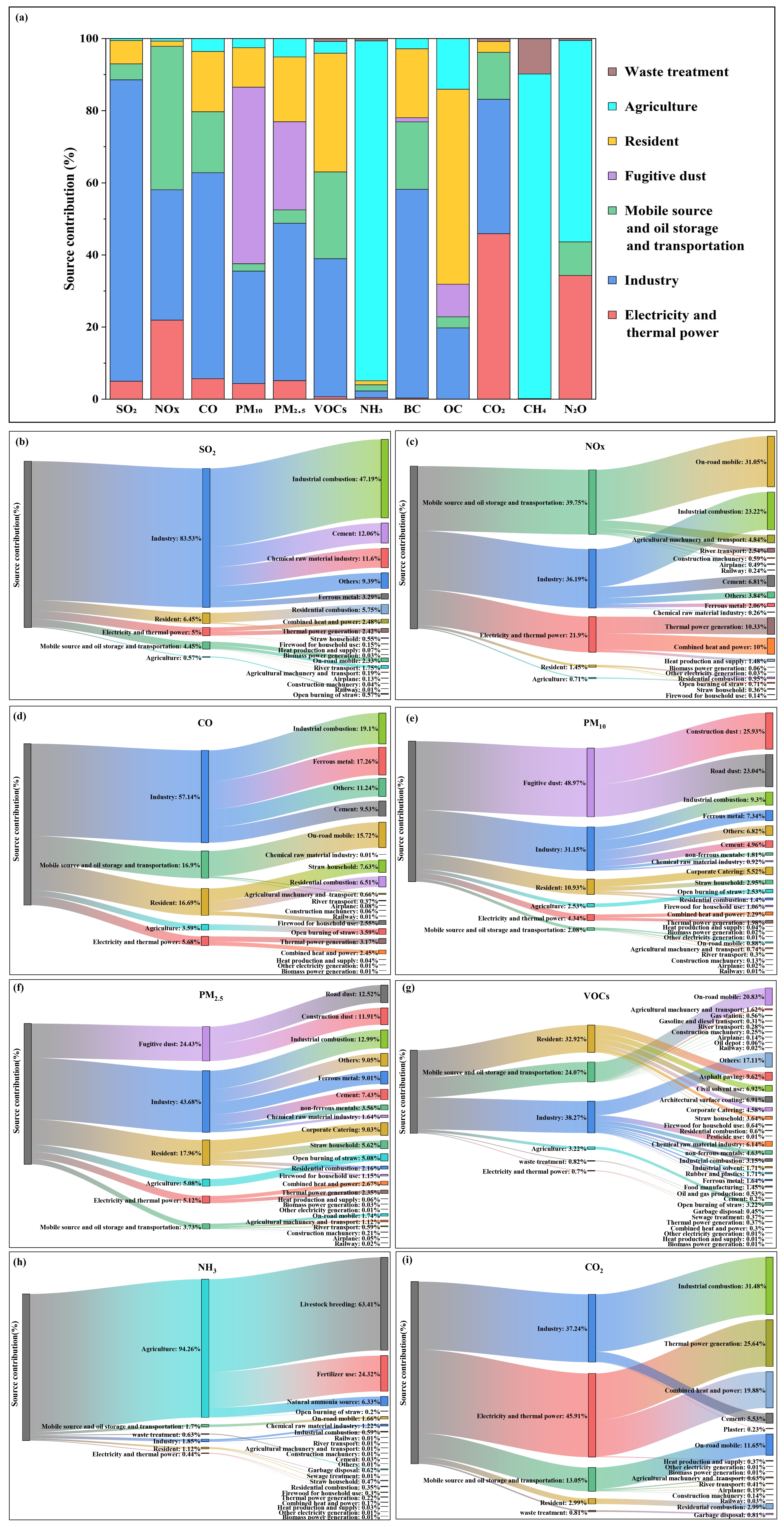 Figure 2Source contributions of air pollutants and GHG emissions. (a) Overall source distribution across pollutants; (b-i) Sub-category source distribution across pollutants: (b) SO2, (c) NOx (d) CO, (e) PM10, (f) PM2.5, (g) VOCs, (h) NH3, (i) CO2.