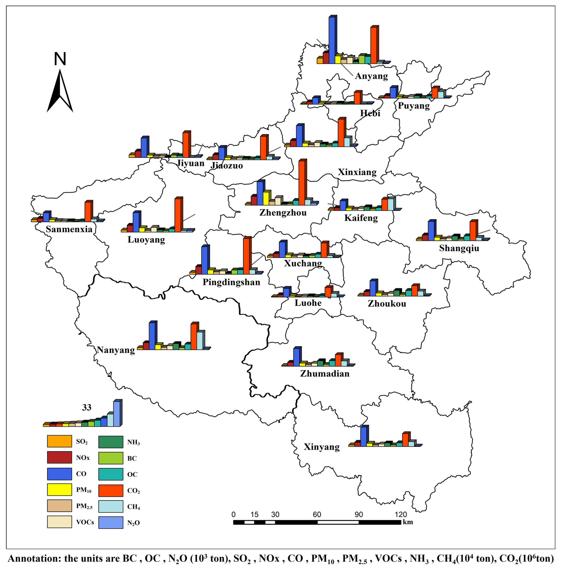 In 2022, the emissions of major species in Henan Province were: SO2 408.7 kt (−43 %, 44 %), NOx at 1336.2 kt (−29 %, 29 %), CO at 4647.3 kt (−46 %, 46 %), PM10 at 901.1 kt (−51 %, 48 %), PM2.5 at 440.0 kt (−44 %, 45 %), VOCs at 759.3 kt (−56 %, 55 %), NH3 at 672.7 kt (−54 %, 52 %), CO2 at 540 462.0 kt (−42 %, 42 %), CH4 at 12 462.0 kt (−38 %, 39 %), and N2O at 42.9 kt (−64 %, 58 %). With industry, electricity and thermal power, mobile source and oil storage and transportation, and agriculture as the primary emission source. Pollutants and GHGs exhibited distinct spatial distribution patterns: the northern heavy industrial region was characterized by both high carbon intensity and elevated pollution levels, with carbon intensity ranging from 1.75 to 3.7 times the provincial average; the central transportation hub was dominated by NOx and VOCs emissions; the western energy-chemical region showed prominent SO2 emission; the southern agricultural region was primarily influenced by NH3 emission and exhibited low carbon emission; and the eastern multifunctional region displayed a multi-source coexistence pattern.