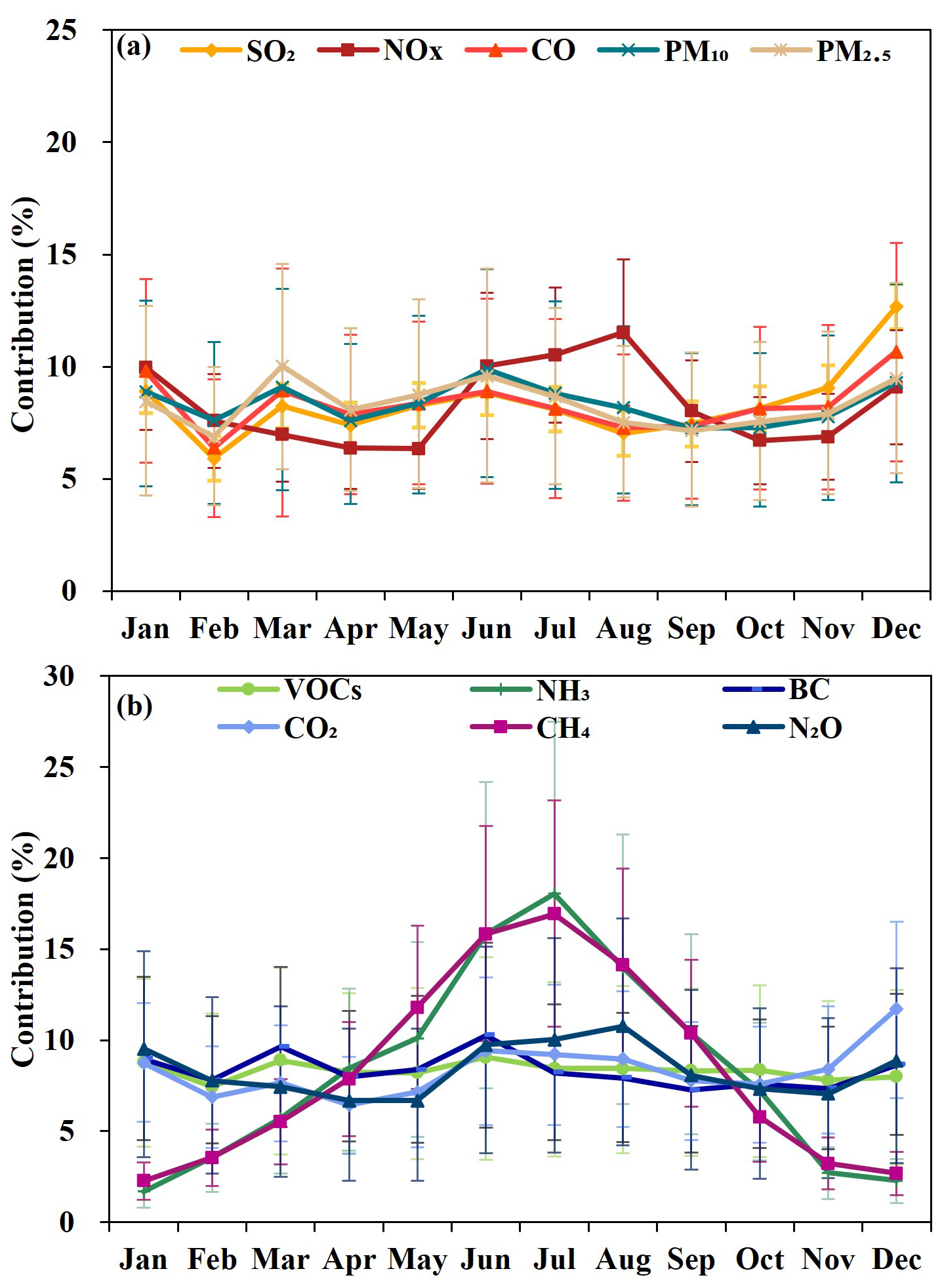 SO2, CO, PM10 and PM2.5 emissions are high in winter (January and December) (Fig. 5). This is mainly due to the increase in pollutant emissions resulting from the large amount of coal and biomass combustion during the heating period in winter. NH3, CH4 and N2O, which have higher emissions in the summer months, especially June and July, and lowest emissions in the winter months (January and December). Primarily caused by elevated NH3, CH4 and N2O releases during summer months due to intensive agricultural practices, such as the application of nitrogen fertilizers and animal excreta management. In winter, when agricultural activities are reduced, emissions of NH3 and N2O are significantly lower. Emissions of VOCs are relatively stable throughout the year, with small fluctuations reflecting their stable sources of emissions. The highest Emissions of NOx are found in August, and the lowest emissions are found in April and May. This is because during the summer vacation, there is an increase in vehicle travel, resulting in higher NOx emissions. Winter CO2 emissions predominantly stem from fossil fuel burning. The substantial demand for heating during winter leads to an increase in fossil fuel consumption, causing emissions to reach their peak. In contrast, the climate in April is mild; heating requirements have ceased while cooling demands have not yet commenced, resulting in energy consumption returning to baseline levels.