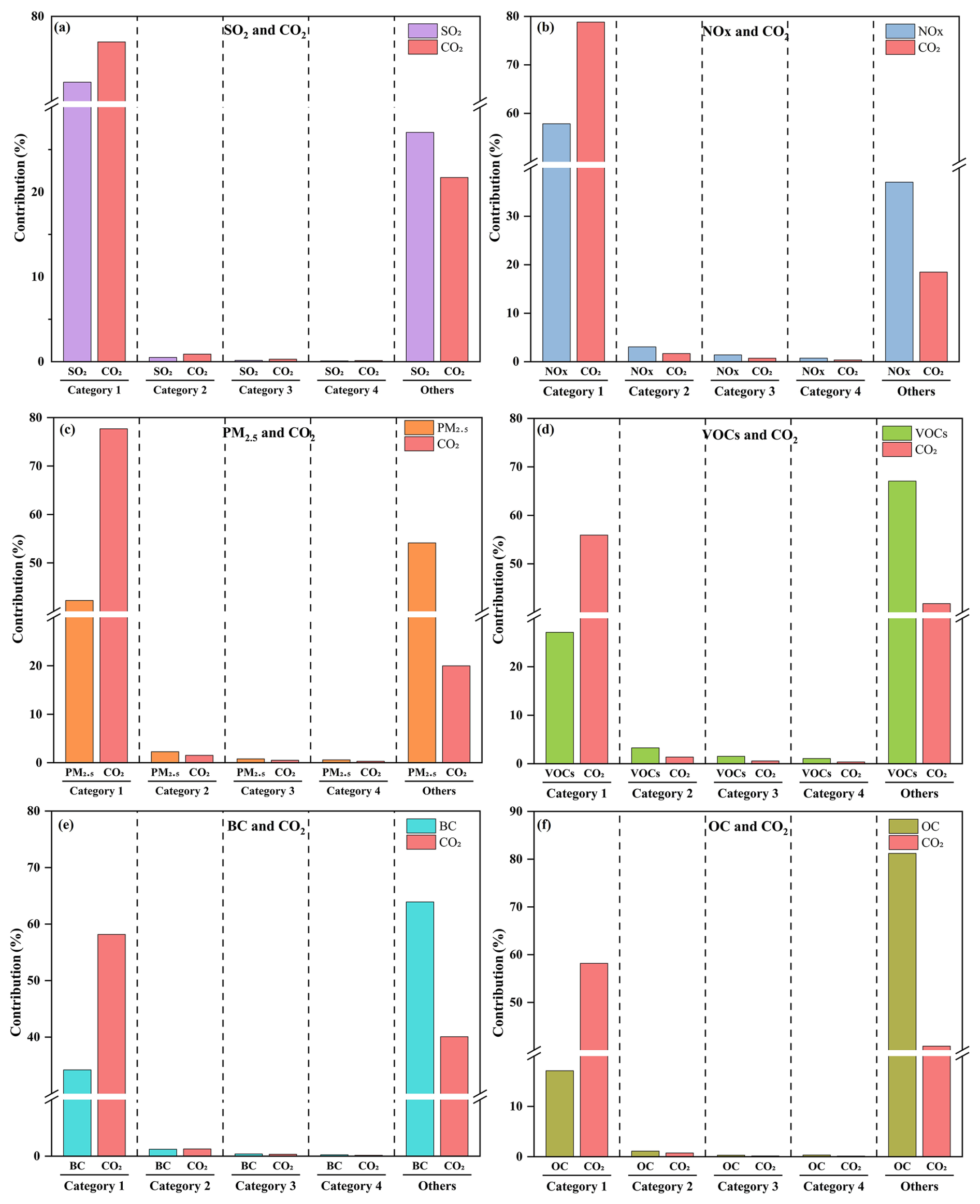 Figure 7Emission contributions of five categories to different emission co-hotspot. (a) SO2 and CO2, (b) NOx and CO2, (c) PM2.5 and CO2, (d) VOCs and CO2, (e) BC and CO2, (f) OC and CO2. Categories represent the grad of grid based on descending order of emissions: Category 1 (top 5 % grids), Category 2 (6 %–10 %), Category 3 (11 %–15 %), Category 4 (16 %–20 %), and Others (bottom 80 %).