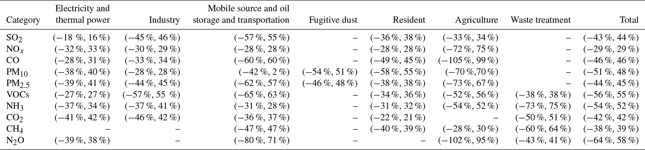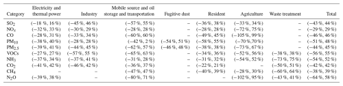Uncertainties in emission inventories arise mainly from the volatility and incompleteness of data on emission factor and activity date of emission source, as well as errors and under-representation of monitoring instruments. These issues are inherent challenges in constructing emission inventory (Super et al., 2020). This study employs the Monte Carlo simulation method to assess the uncertainty of the emission inventory. With respect to the probability distribution characteristics of emission factors, a 10 000-iteration random sampling simulation is conducted to calculate the 95 % confidence intervals for pollutant emissions from each source category (Table 3). Among all pollutants, the emissions of NH3, VOCs, and N2O show relatively high uncertainty. This is mainly due to the limited representativeness of emission factors and difficulties in collecting reliable activity data. For NH3, the main source of uncertainty lies in activity data, with waste treatment showing the highest uncertainty (−73 %, 75 %), followed by agriculture (−54 %, 52 %). The primary reason is the complexity of emission processes and challenges in accurate monitoring. In waste treatment, different treatment technologies and variable waste composition contribute to emission uncertainties (Zheng et al., 2012). In agricultural activities, varying fertilization practices and changing climatic conditions significantly influence NH3 volatilization, while farmers often lack detailed fertilization records (Lessmann et al., 2025). These factors collectively contribute to the substantial uncertainty in emission data. For VOCs, uncertainty mainly arises from the applicability of emission factors. In sectors such as mobile source and oil storage and transportation, emission levels vary widely due to vehicle conditions, fuel quality, and equipment aging, resulting in an uncertainty of up to −65 % and 63 %. For N2O, uncertainty is primarily concentrated in agricultural source. Data Gaps in data regarding livestock manure management – including treatment methods, storage duration, and application practices – make it challenging to accurately quantify emissions, particularly for small-scale farms (Hu et al., 2024).