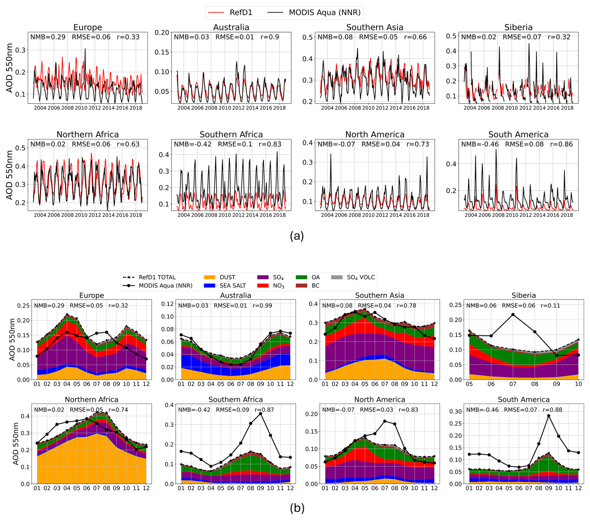 Because the Ref-D1 is not driven by real meteorology, we focus our analysis on monthly and yearly timescales. For regional analysis over land, we divide the globe in 8 geographical regions: North America, South America, Northern Africa, Southern Africa, Europe, Siberia, Southern Asia, Australia. The geographical boundaries for the region are reported in Fig. S1 in the Supplement. This regional aggregation follows the approach from Collow et al. (2024), which was designed to capture continental-scale trends and behaviours in aerosol distributions. In particular, South Asia and East Asia are grouped together because they are both dominated by anthropogenic aerosol sources, particularly from major populated regions in India and China. While we acknowledge that there are important sub-regional differences within this large domain, the continental-scale analysis allows us to examine broad patterns in model performance across regions with similar dominant source characteristics.