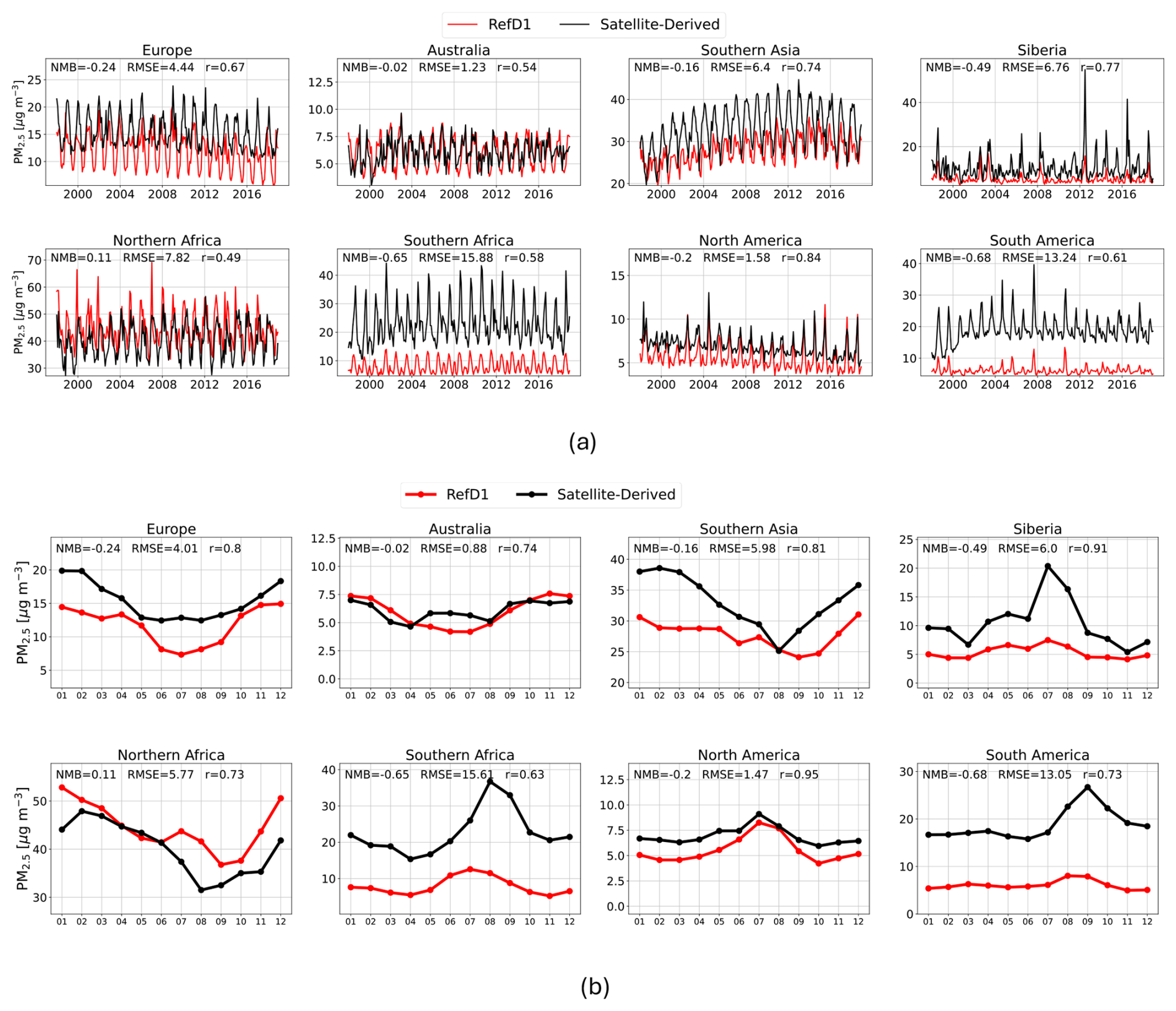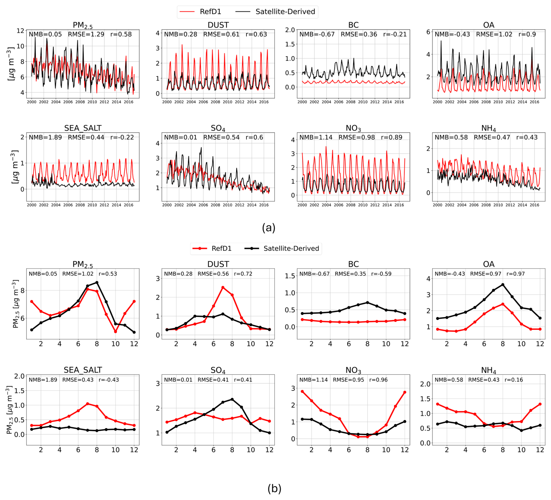 The modelled surface total PM2.5 are compared with satellite-derived PM2.5 model-data fusion datasets developed by the Atmospheric Composition Analysis Group at Washington University in St. Louis and available at https://sites.wustl.edu/acag/datasets/surface-pm2-5/ (last access: 10 November 2025). In these datasets, monthly high-resolution surface PM2.5 over land are estimated combining information from satellite derived AOD, a chemical transport model, and surface observations from ground-based monitoring networks. The AOD retrieved from multiple satellites is combined to produce a monthly best-estimate satellite-based AOD using a weighted average based on the level of agreement with AERONET. Simulations from the GEOS-Chem chemical transport model were used to establish the relationship between the total AOD and surface PM2.5 and applied to the satellite AOD best estimate to produce a geophysical estimates of surface PM2.5. Subsequent statistical fusion incorporated additional information and corrections from PM2.5 ground-based measurements.