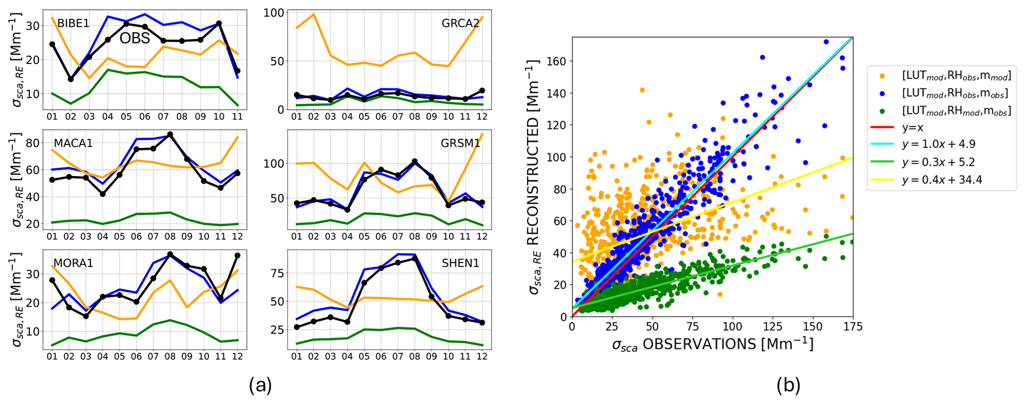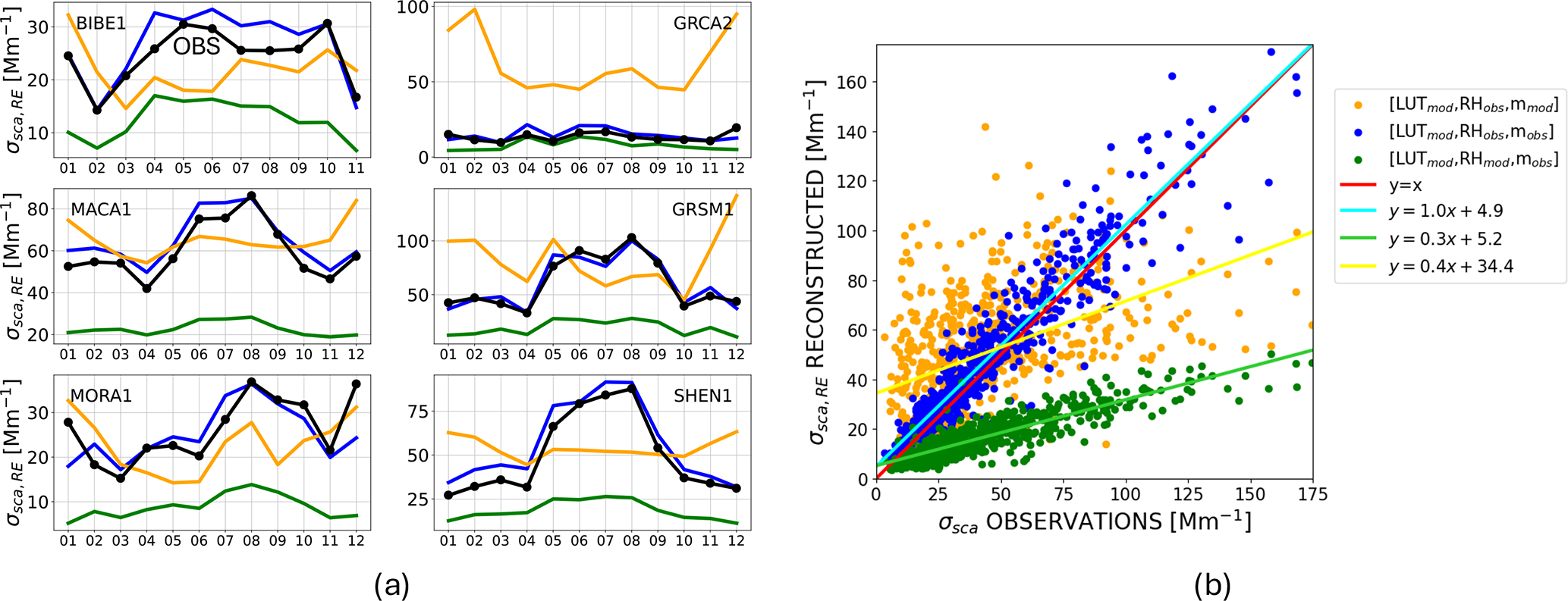 Figure 9Reconstructed scattering for 3 different combinations of modelled and observed RH, PM2.5 and LUT as described in Sect. 3.5. (a) Seasonal cycle of reconstructed scattering at the selected sites. Observations are reported with the black line. (b) Scatter plot of the reconstructed scattering with all monthly data.