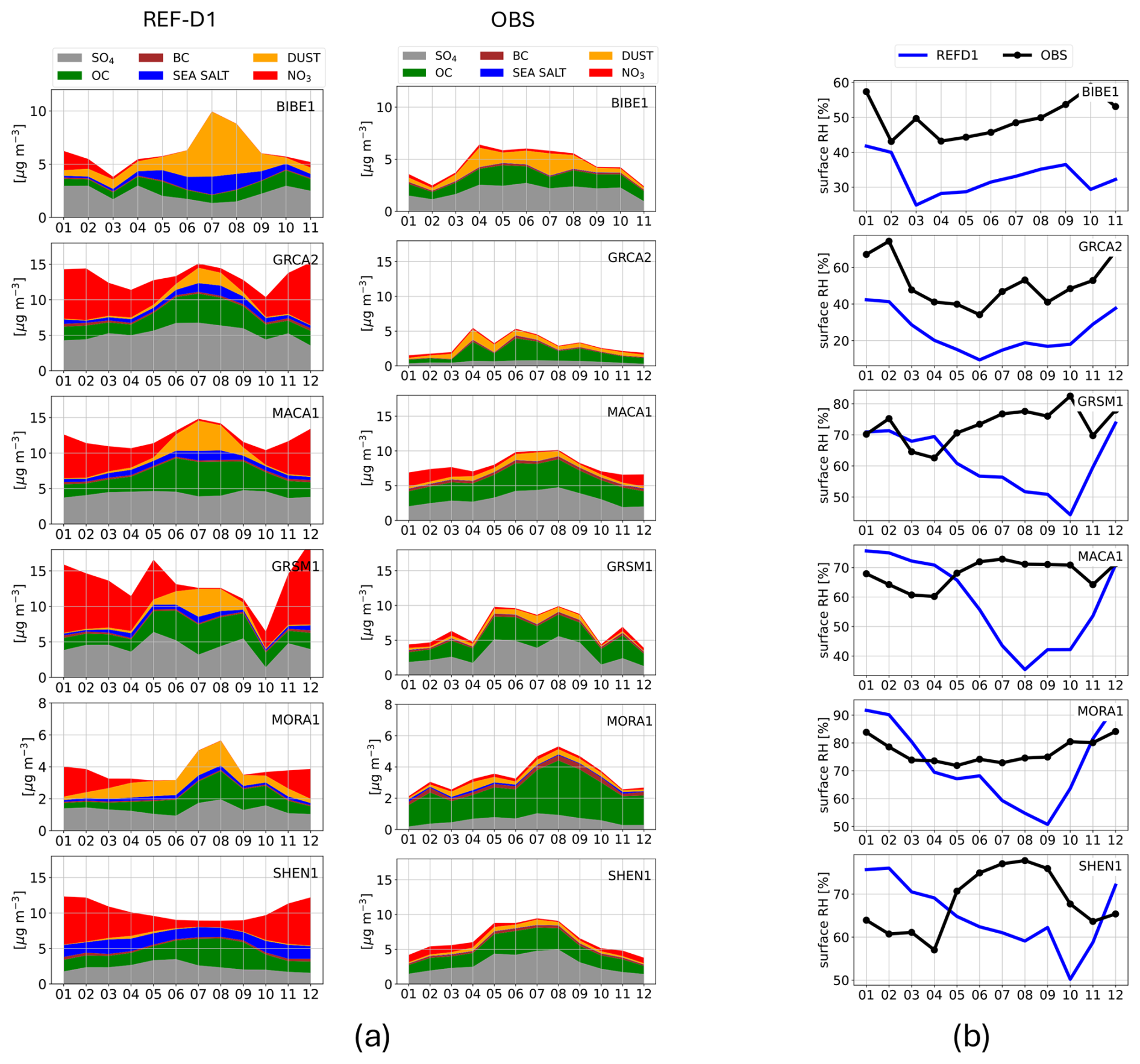 Figure 10Comparison between Ref-D1 and observations for the seasonal cycle of (a) surface PM2.5 components (a) and (b) surface RH at selected IMPROVE sites. Individual species are measured and compared at RH =0 % (dry mass).