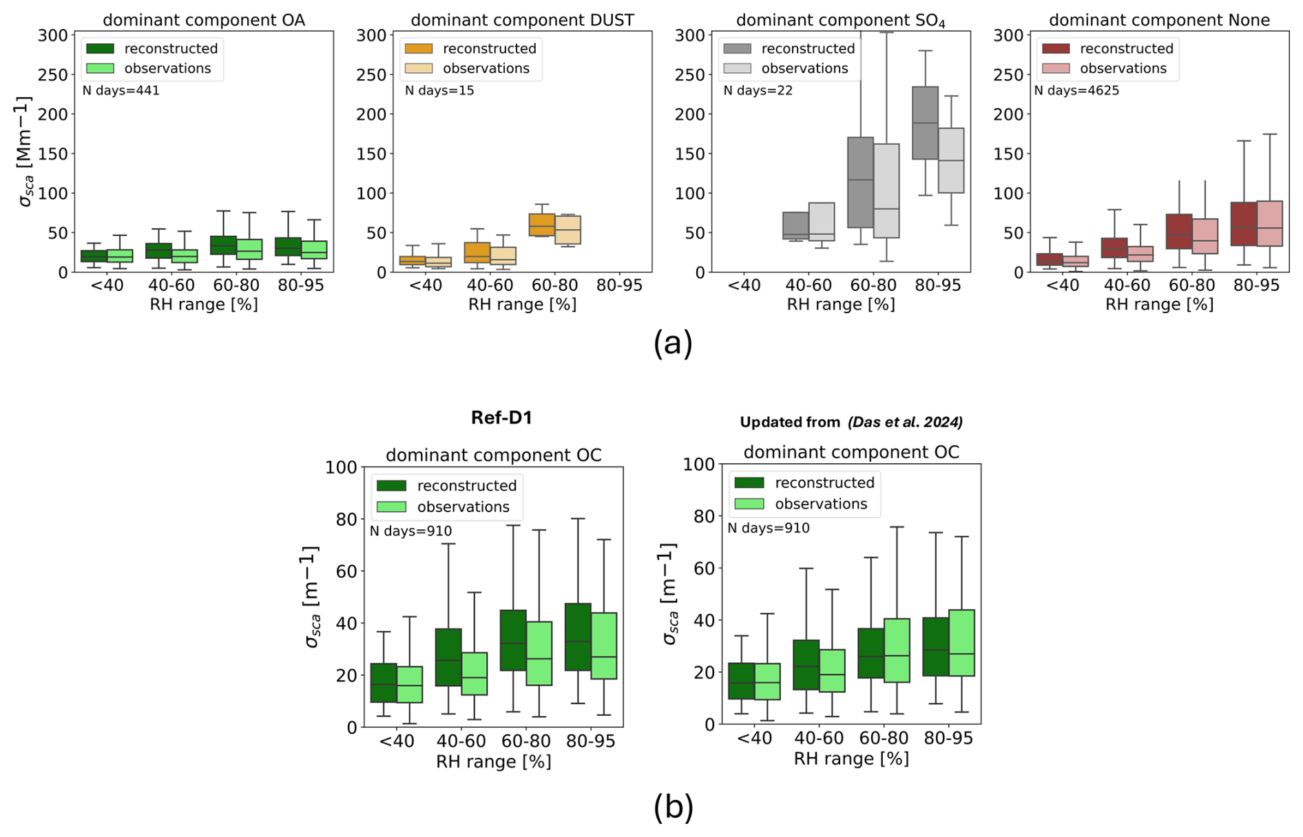 We further analyze the role of model assumptions of aerosol optical properties by sorting the reconstructed scattering coefficient for different RH range and dominant PM2.5 component, as shown in Fig. 11. Overall, where the dominant component is OA, dust, or SO4, the distribution of the reconstructed scattering coefficient agrees well with observations for all different RH ranges, suggesting that the model assumptions of aerosol optics for each of these species is adequate. However, it is possible to further improve the model representation of aerosol properties. For example, the reconstructed scattering coefficient derived using an updated set of optical properties developed by Das et al. (2024) for biomass burning organic aerosol, is in better agreement with observed scattering coefficients compared to using default optics, especially in regions where OA is the dominant component (Fig. 11b).