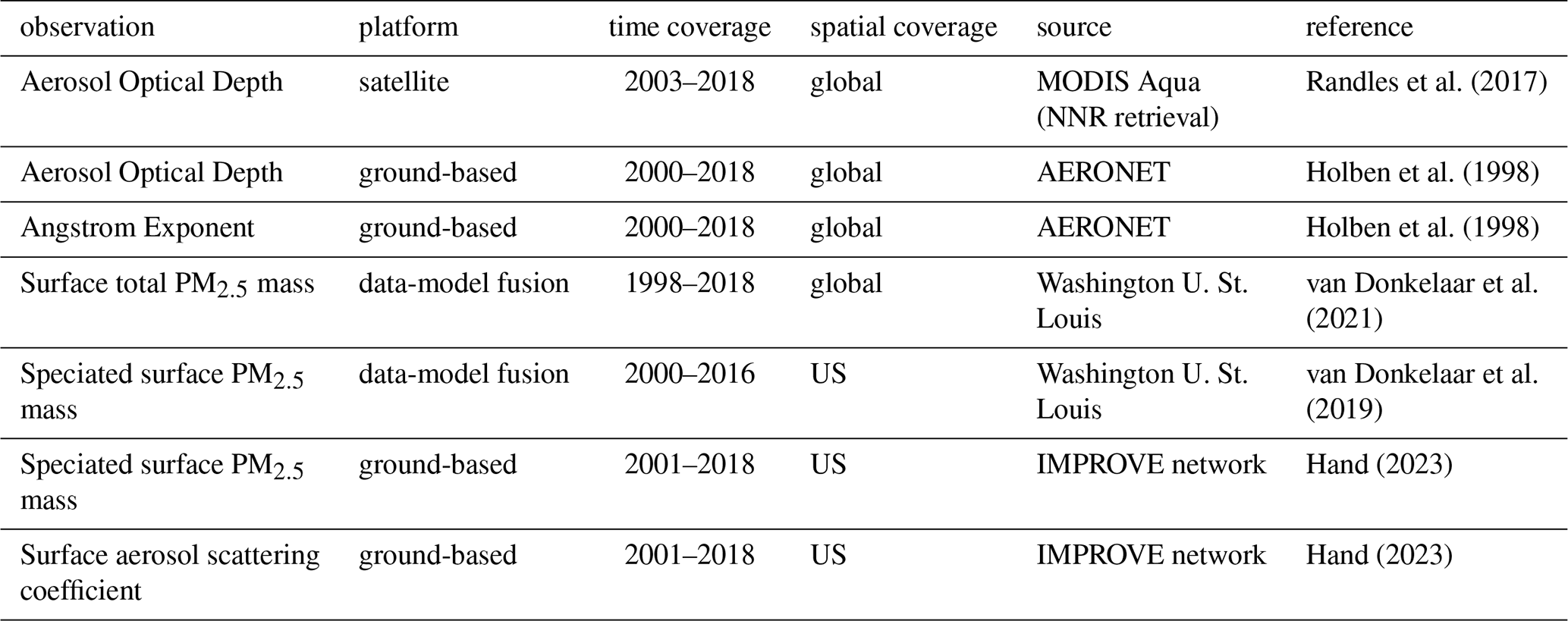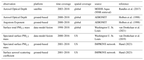 Here we describe in detail each dataset and the methodology used in the evaluation of mass and optical properties of aerosols in the Ref-D1 run. Table 1 summarizes the observations used.