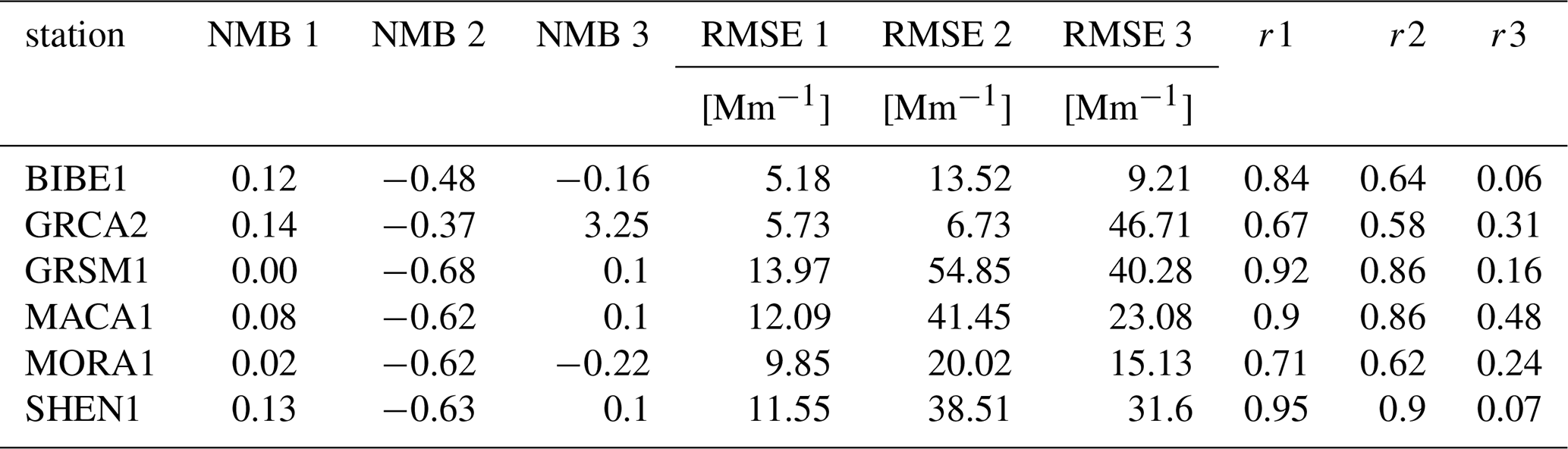 Additionally, we use long-term co-located measurements of speciated PM2.5 and scattering coefficient to investigate the relationship between surface PM2.5 and surface aerosol optical properties. Scattering coefficient at 550 nm together with ambient RH is measured at a subset of IMPROVE sites through open-air integrating nephelometers. Measurements are reported hourly. We filter hourly nephelometer measurements with RH ≦95 %, with scattering coefficient <5000 m−1 and rate of change less than 50 Mm−1 h−1 to exclude the interference of meteorology (e.g. fog episodes), following the procedure used in Latimer and Martin (2019). Subsequently, we consider only days with at least 12 valid hourly measurements to obtain average daily values. We then consider stations with co-located scattering and PM2.5 measurements and subset only days where both valid PM2.5 and scattering are measured. We select months with at least 6 valid daily measurements out of a max of 11 (PM are measurements are done every 3 calendar days). This selection procedure results in 6 sites with long-term measurements of both speciated PM2.5 and scattering coefficient and RH, presented in Fig. S6 and listed in Table S3. An important source of uncertainty in our model-observations comparison with the IMPROVE data (as well as the AERONET data) stems from the representativeness error when comparing point measurements with model grid cells (1°×1°). Focusing our comparisons on seasonal and monthly statistics derived from long-term observations can help mitigate this sampling mismatch. Additionally, IMPROVE measurements can be subjected to sampling artifacts, particularly volatilization losses during particle collection and handling. Ammonium nitrate, for instance, can evaporate during filter sampling, leading to underestimation of nitrate concentrations and total PM2.5 mass (Hand et al., 2023; Ward et al., 2025).