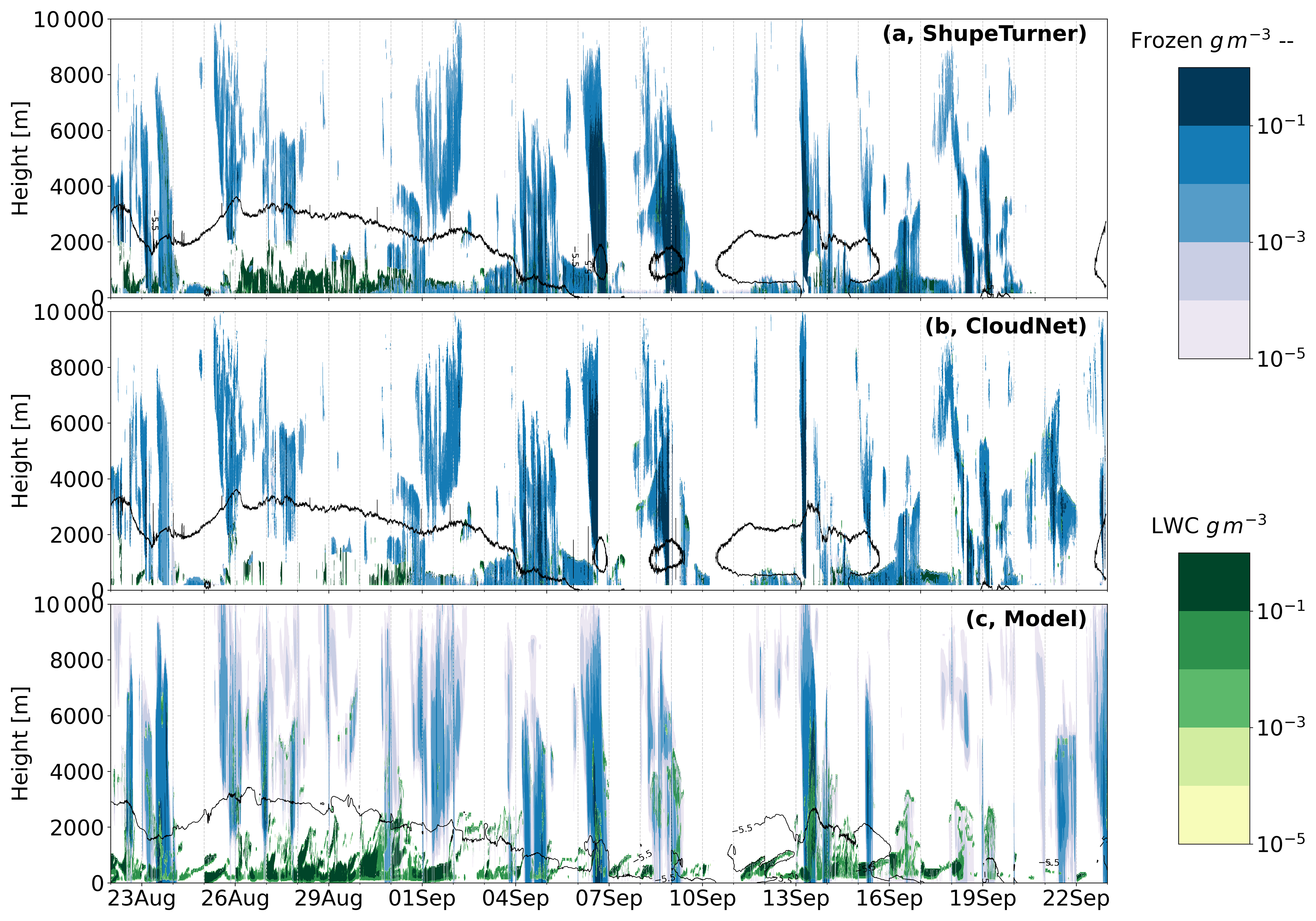 Figure 4 presents the results of the 32 consecutive simulations and the observations; CloudNet (Engelmann et al., 2024) and the ShupeTurner microphysics retrieval (Shupe, 2023). Generally, the model represents the observed clouds remarkably well. The persistent boundary layer clouds are captured. However, the cloud phase tends to be predominantly liquid in these simulated low clouds compared to the retrieved mixed-phase or ice character, visible primarily in the frozen precipitation falling from the liquid cloud tops of the lower cloud layers. A similar problem was identified in Wallentin et al. (2025). A −5.5 °C isotherm is shown in each panel in Fig. 4, where we can note the high altitude of the isotherm until 7 September. The model cannot generate primary ice below this altitude (apart from low rates of rain freezing), and any ice present must be supplied through seeding for those low-level clouds to be mixed-phase. Notably, the microphysical retrievals differ at these temperatures. The CloudNet retrieval lacks liquid clouds as well as cloud ice compared to the ShupeTurner algorithm and the model. Likely, these clouds were detected as rain or drizzle and thus are not present in the LWC product. The uncertainty in retrieved IWC, and especially the vertical distribution of cloud ice at these warm temperatures, may be a limiting factor in this discussion.