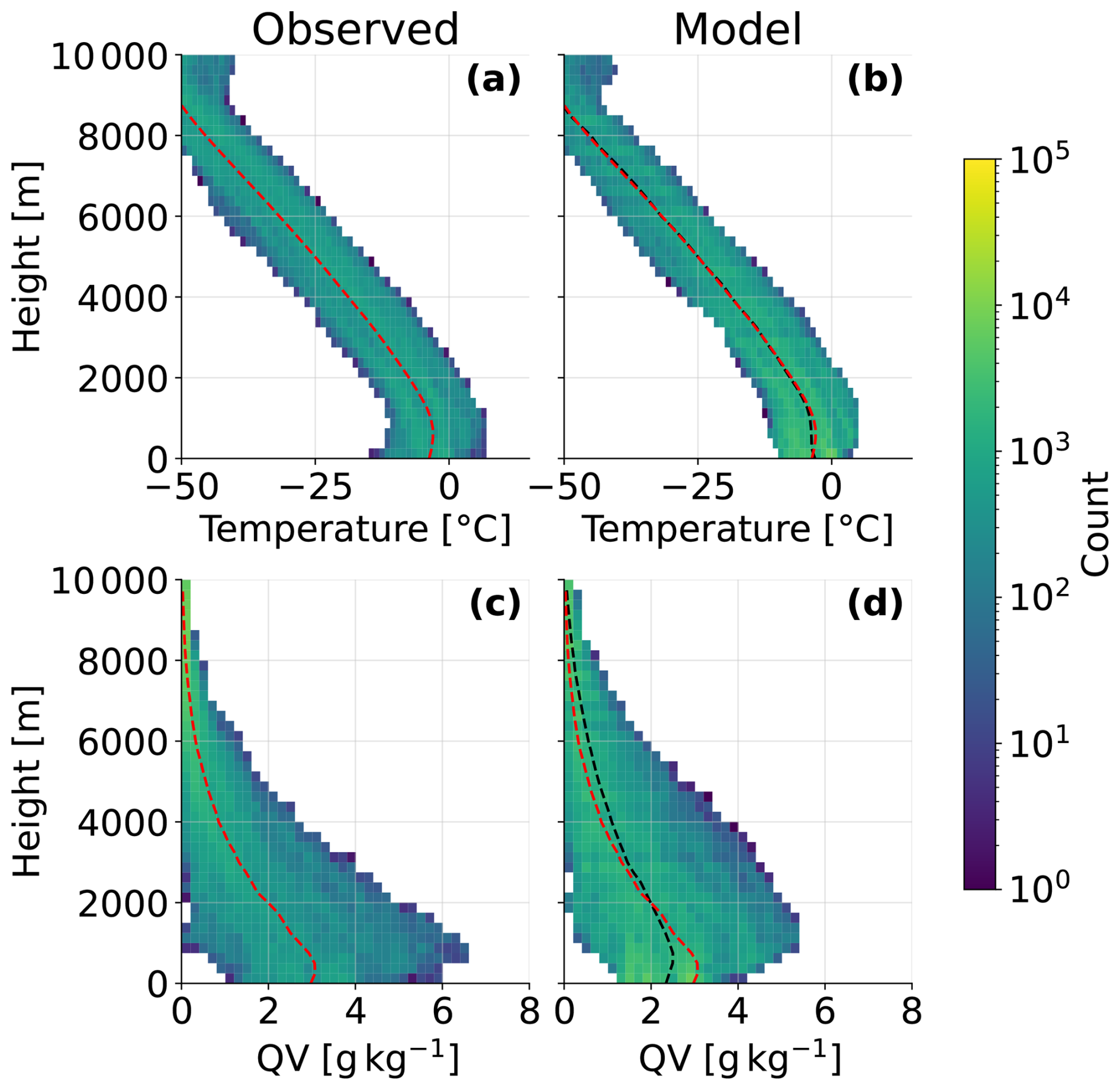 Figure 6Height-resolved occurrence rate of temperature (a, b) and water vapour mixing ratio (QV) (c, d) from soundings (a, c, Maturilli et al., 2022) and model simulations (b, d). Mean profiles are shown as dashed lines in red for the observations and black for the model. In panels (b) and (d), the observed mean profile is included for easier comparison.