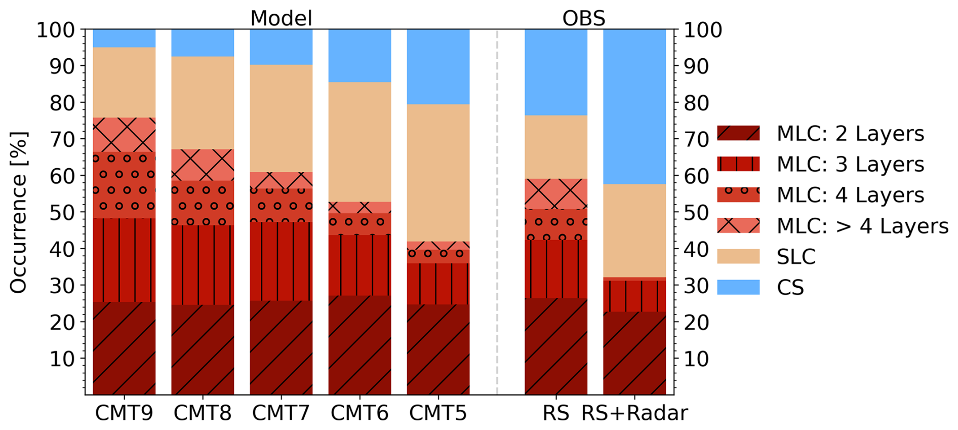 The observed MLC occurrence for the MOSAiC site is presented in the last two bars in Fig. 7 using the algorithm by Vassel et al. (2019) with updates by Achtert et al. (2026). A 59 % occurrence of MLCs is identified using only the radiosondes (supersaturated layers) as a detection method (RS). This gives a 17 % occurrence of SLCs. The profiles are most commonly two-layered, but similarly to the model, a high occurrence of three layers is found, while four or more layers are found less frequently. The inclusion of the validation method (cloud presence) using radar collocation (RS+Radar) reduces the MLC occurrence drastically. Reasons for the large reduction include a large presence of supersaturated layers without cloud mass present, difficulties distinguishing seeding layers, removal of low clouds and fog layers below the lowest radar gate, or attenuation in the radar, limiting high-cloud occurrence. Further details regarding the features and limitations of the observed cloud-layer detection are provided in Achtert et al. (2026). The MLC occurrence reaches 32 % with a large proportion of SLCs (26 %) and clear-sky (42 %). The total cloud fraction of about 58 %, as well as the MLC/SLC partitioning, is lower but compares to the findings by Barrientos-Velasco et al. (2025) during MOSAiC. Interestingly, a common occurrence of 2-layered MLCs is found across the model and observations, irrespective of the smaller total MLC occurrence. The similarities in the representation of the approximately 22 % occurrence of two-layered clouds may be purely coincidental, constrained by the classifying algorithms, or a physical phenomenon we do not yet understand.