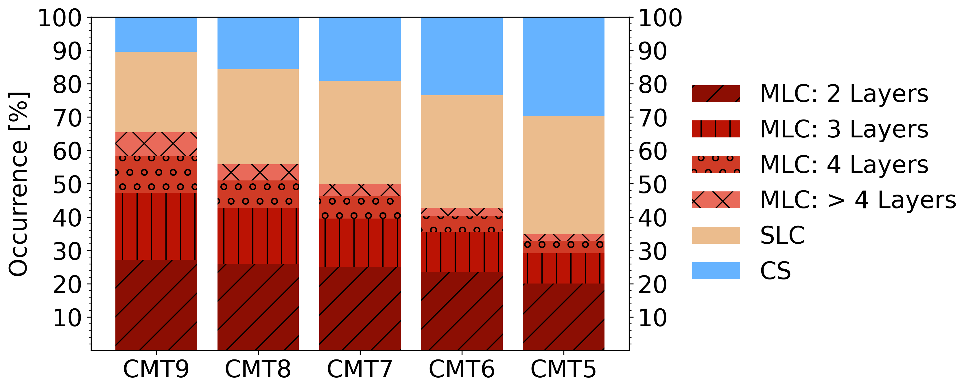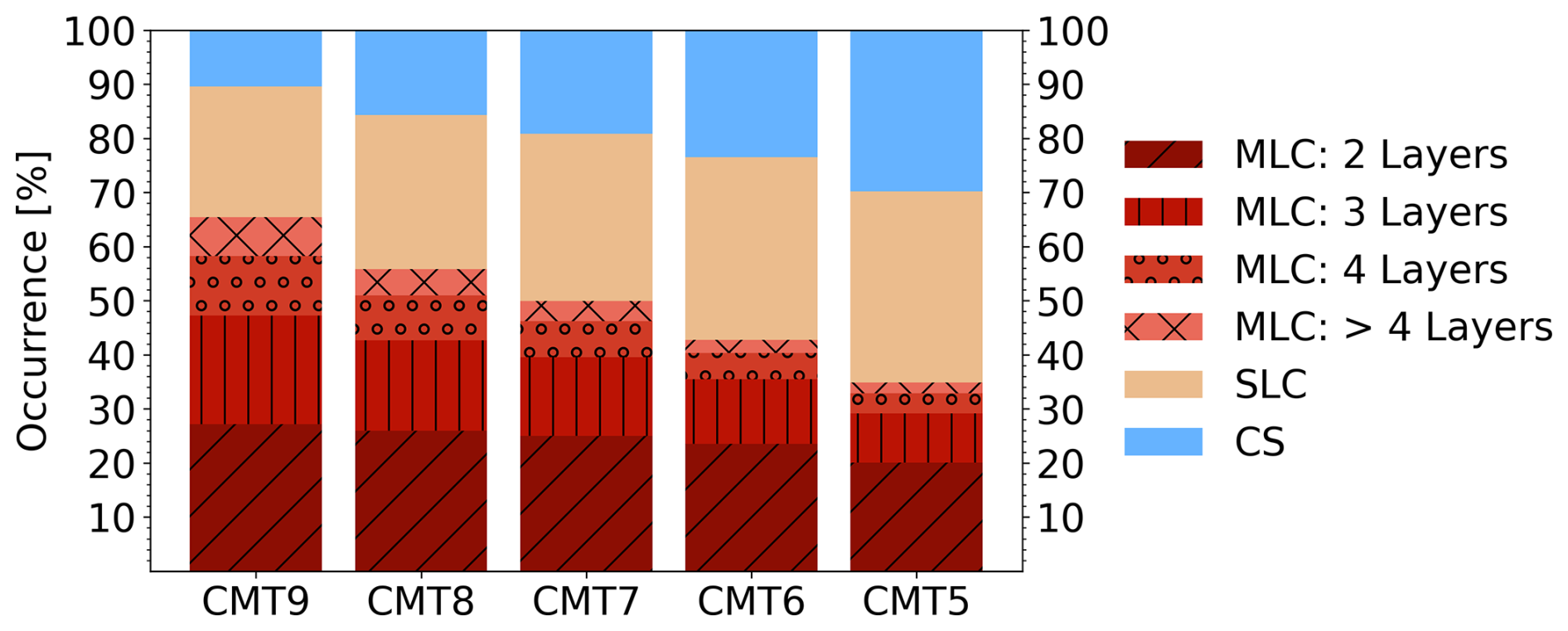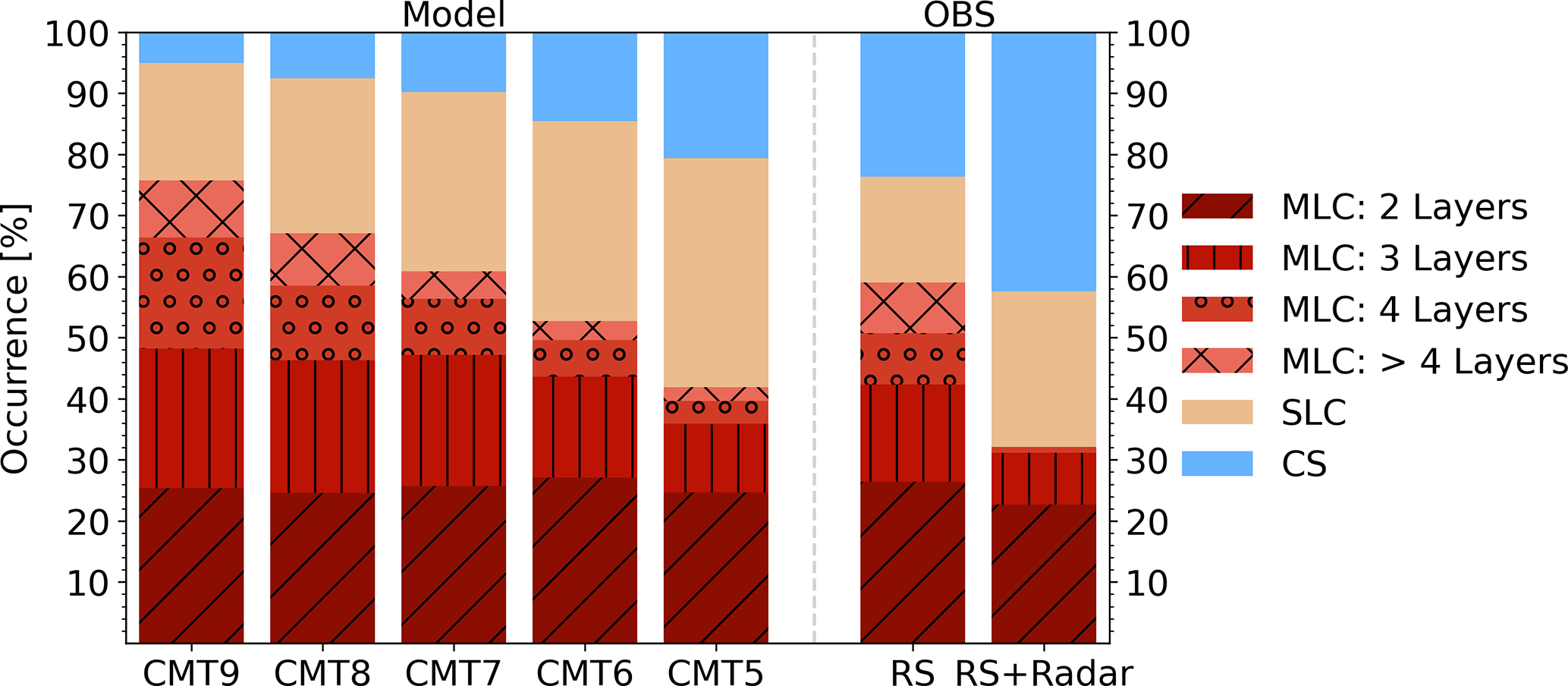 While highly sensitive to the thresholds and model assumptions used, a high frequency of MLCs that is comparable to the statistics of MOSAiC is found for the wider Arctic. The increased occurrence of CS might be the result of a less cloudy Arctic at lower latitudes. Separating the MLC fraction into the number of MLC layers in each profile, in the sub-categories of the MLC bar in Fig. 9, a high frequency of two-layered structures is found. Three-layered structures and MLC systems with more layers systematically decrease with a higher CMT.