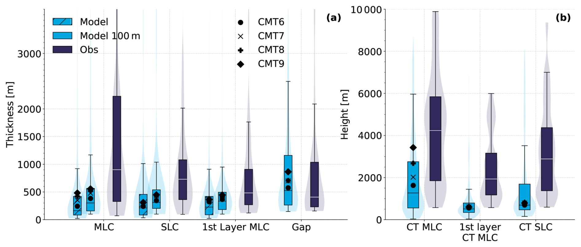 The gap thickness (“Gap” in Fig. 8a), the depth of the subsaturated layer separating two cloud layers in the MLC system, reaches medians of 526–864 m (408 m) for the model (observations). The majority of modelled and observed cloud gaps are less than 3 km deep. This indicates that the occurrence of a double-layered structure with cirrus clouds overlaying boundary-layer clouds is rare. In fact, only 0.7 %–8 % (2 %) clouds have a gap thickness of > 5 km in the model (observations). These results are in line with the full year analysis of observed MLCs during MOSAiC (Achtert et al., 2026, their Fig. 8) who find that the gap thickness is generally below 3 km.