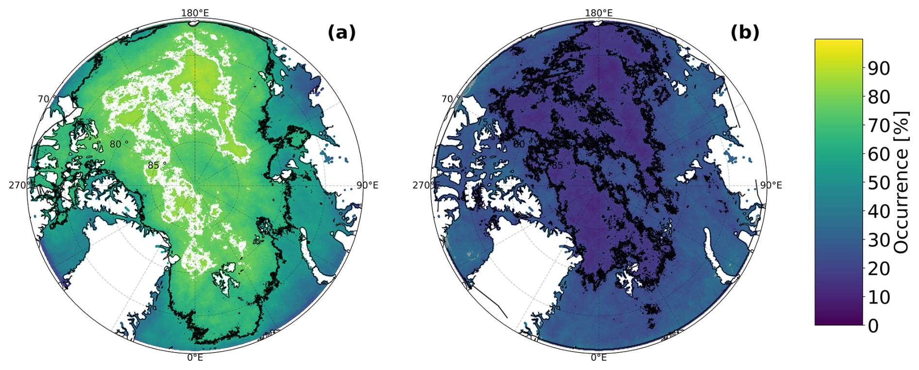Multilayer clouds (MLCs), vertically stacked cloud layers, occur with a mean global frequency of about 30 % (Wind et al., 2010; Liu et al., 2012; Wang et al., 2016; Subrahmanyam and Kumar, 2017; Matus and L'Ecuyer, 2017; L'Ecuyer et al., 2019; Marchant et al., 2020). In the Arctic, these clouds are found to occur more frequently with occurrence frequencies between 29 % and 60 % (e.g. Herman and Goody, 1976; Tsay and Jayaweera, 1984; Intrieri et al., 2002; Liu et al., 2012; Vassel et al., 2019; Nomokonova et al., 2019; Vüllers et al., 2021; Silber and Shupe, 2022; Achtert et al., 2026). Meanwhile, due to the lack of vertically resolved satellites above 82° N, the MLC classification from space is limited in the high-Arctic region. Thus, the MLC frequency of occurrence remains difficult to ascertain due to instrument limitations and varying classification approaches.