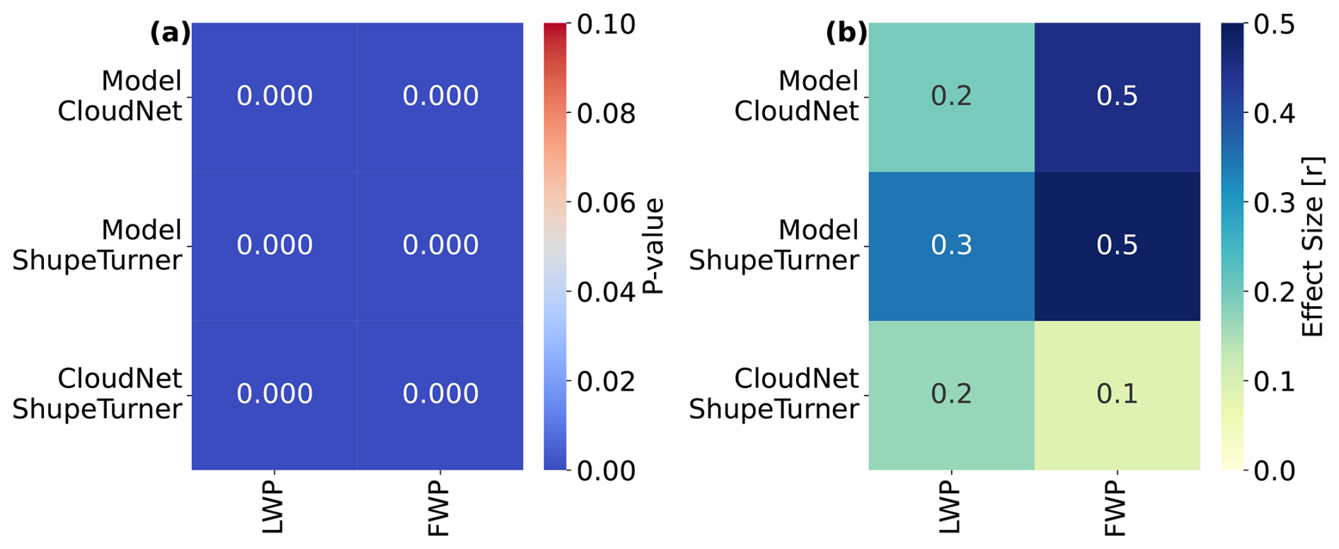 Figure 5 shows the column-integrated LWP and frozen water path (FWP) for the model and the two microphysics retrievals. We define an FWP category to more easily compare with observed cloud ice. In the model, this includes cloud ice, snow, and graupel, while in the observation, this is classified as ice. LWP is here the column-integrated LWC and thus differs slightly between the retrievals. Meanwhile, the model underestimates the median LWP by a factor of about 2.5 (2 for CloudNet, 3 for ShupeTurner). In the FWP category, the observational products differ more (factor of 1.5), but a larger discrepancy for the model can be seen. Approximately two orders of magnitude difference is found between the datasets, highlighting the lack of cloud ice seen in Fig. 4c. We perform the non-parametric statistical Mann–Whitney U test (Mann and Whitney, 1947) (Appendix A, Fig. A1a) to explore to what extent the distributions differ. Statistical significance (p < 0.05) is found for both LWP and FWP for the model and observations. To complement the statistical significance, an evaluation of the effect size is performed (see Appendix A for details). The effect size can assess the importance of the results obtained in the statistical test (Tomczak and Tomczak, 2014; Ialongo, 2016) and accounts for the practical significance (Sullivan and Feinn, 2012). Effect sizes (r, Fig. A1b) for LWP are small (r ≤ 0.3) but reach medium (r ≈ 0.5) values for FWP between the model and the observational products, indicating some practical as well as statistically significant differences in the datasets.