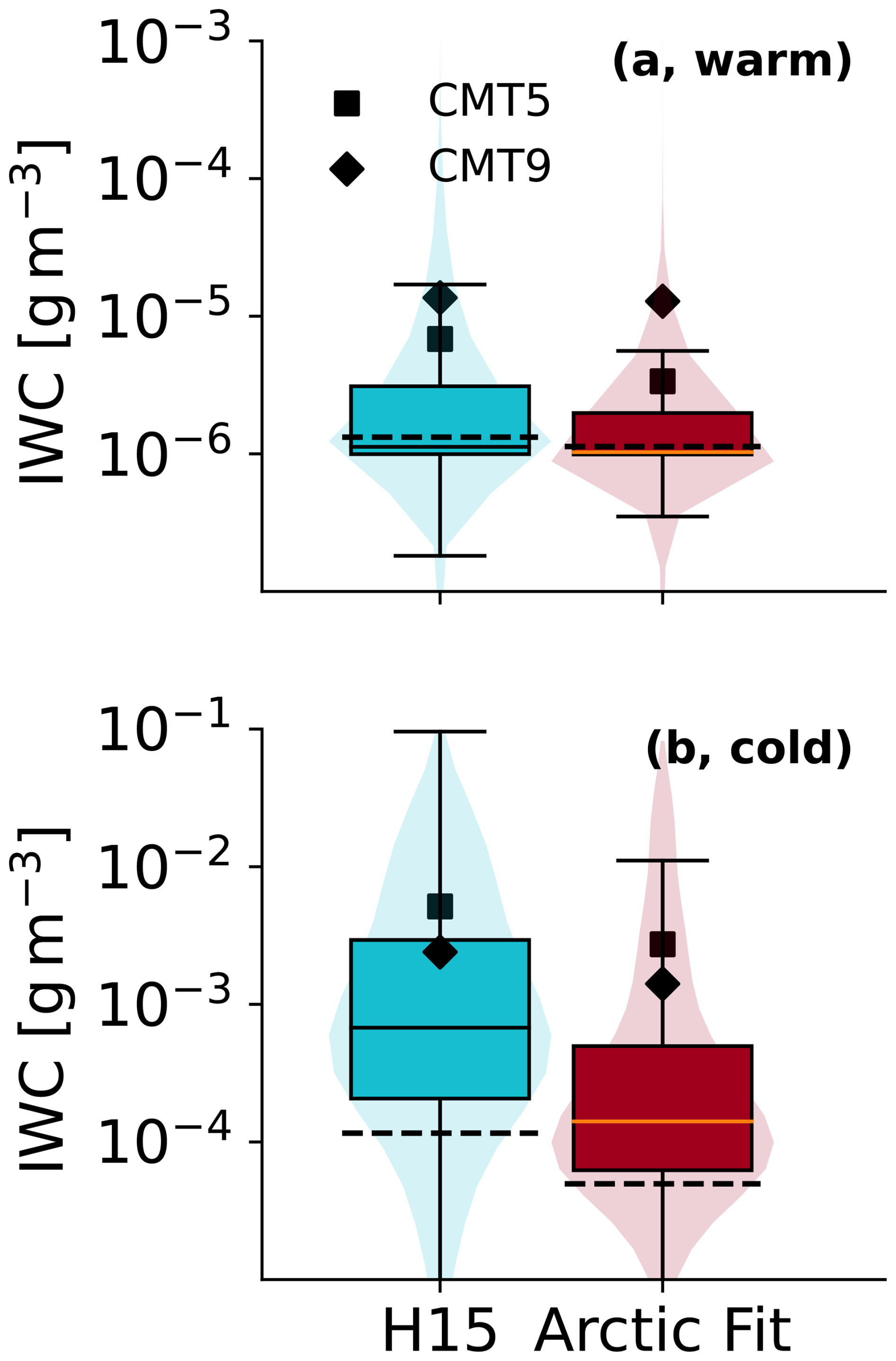 Figure 3Log-transformed statistics of Nice of SLC cloud-tops for the H15 parameterisation and the Arctic fit filtered according to cloud-top temperatures in the range −12 °C ≤ T < −5 °C (a, warm) and −30 °C ≤ T < −12 °C (b, cold). The box shows the 25th to the 75th quartile for CMT5, defined as the interquartile range (IQR). The median is represented by a black line for CMT5 and with dashed lines for CMT9, with whiskers extending from the box to the furthest data point that lies within 1.5 times the interquartile range (IQR) in logarithmic space (minimum values are defined similarly, though these reach very low values). Values larger (or smaller) than these are outliers and are not shown (only in the figure) to simplify the visual interpretation. Violin plots show the distribution of CMT5. Mean values are shown with markers as indicated in the legend.