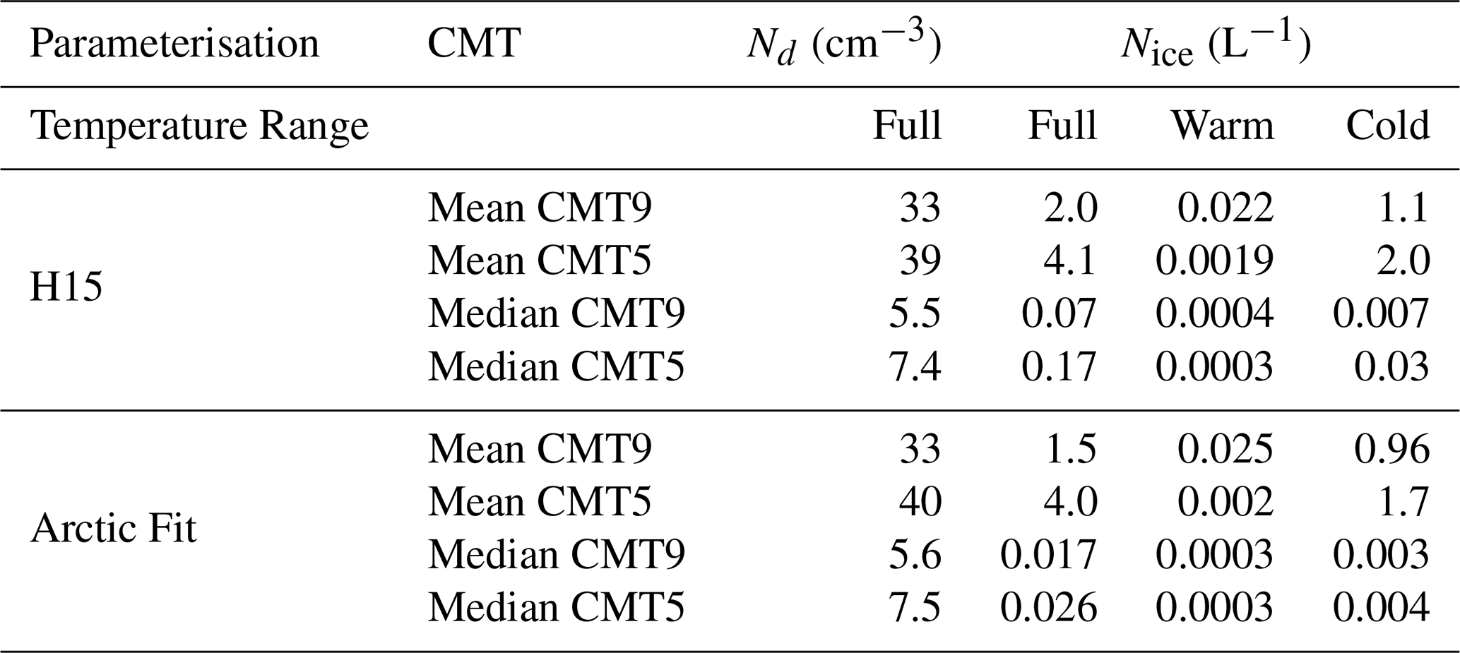 Overall, the impact of changing the INP parameterisation on the full domain is small. For completeness, cloud ice mass concentrations are shown in Fig. B1 and, as expected, do not increase with the new parameterisation; rather, a 9 %–15 % (CMT9-CMT5) decrease is found at warm temperatures. However, the small changes in Nice can enable local INP activation at higher temperatures (T > −12 °C), which better represents the Arctic abundance of warm-activating INPs. Thus, for the simulations performed here, we use the Arctic fit parameterisation.