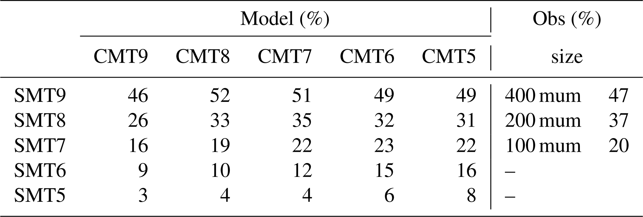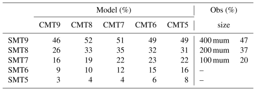 We find that up to half of the modelled MLCs have been seeded according to the criterion described in Sect. 3. This specification requires that cloud layers have a combined snow, graupel, and cloud ice mass above the SMT falling into the cloud from a sub-saturated layer above. A large dependency on this threshold is observed, and the seeding frequencies using different SMTs based on different CMTs are tabulated in Table 2. The cloud mass threshold has a small impact on the seeding occurrence. Rather, the SMT is the governing factor in terms of seeding occurrence. With SMT5, negligible seeding occurs. From the observational algorithm (Achtert et al., 2026), we find that with 400 µm ice crystals, 47 % of MLCs seed the layer below or, more specifically, have the potential to do so. The respective (potential) seeding frequencies for ice crystals of sizes 200 and 100 µm are tabulated in Table 2. We do not currently possess an evaluation method that can single out which ice crystal size is more likely to occur and seed the lower layer.